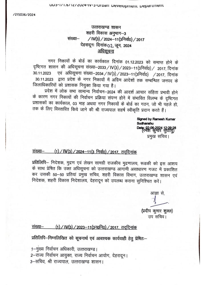 देहरादून से आज की बड़ी खबर।3 महीने और बढ़ाया गया निकायों में प्रशासकों का कार्यकाल।2 जून को हो रहा था प्रशंसकों का कार्यकाल खत्म।.