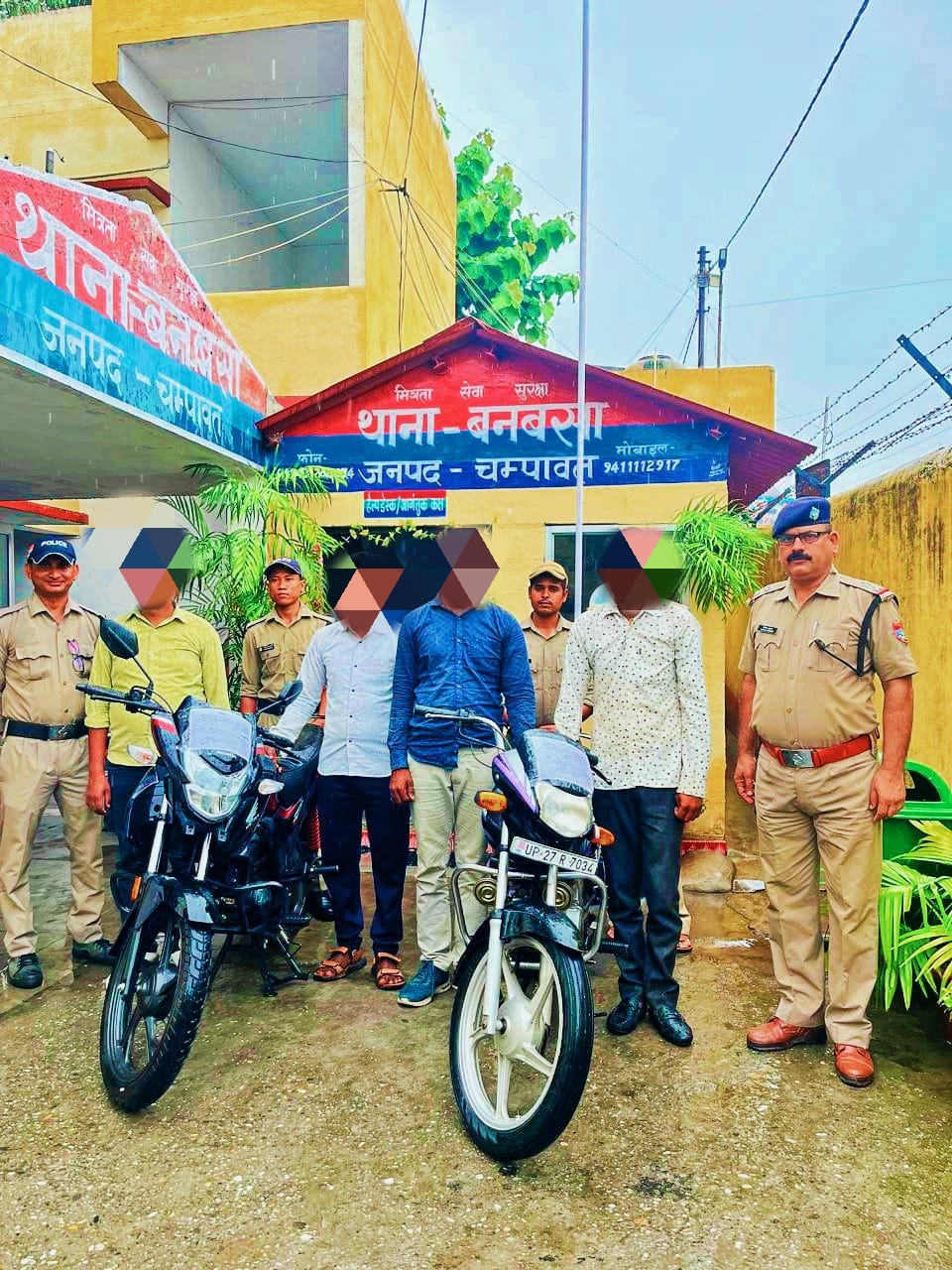 उक्त के क्रम में दिनांक 27.06.2024 को *जनपद चम्पावत* के *थाना बनबसा* क्षेत्रान्तर्गत *थानाध्यक्ष बनवसा श्री लक्ष्मण सिंह जगवाण* तथा *एस.ओ.जी प्रभारी श्री मनीष खत्री* के कुशल नेतृत्व में *स्ट्रांग फार्म के पास नेशनल हाईवे पर मो०सा० संख्या UP 27 R 7034 हीरो होन्डा* व एक अन्य *मो०सा० होन्डा बिना नम्बर प्लेट* में 04 अभियुक्तों को 840 ग्राम *स्मैक परिवहन* करते हुए *गिरफ्तार* किया गया। जिस सम्बन्ध में *थाना बनबसा* में मुOFIR NO-70/2024 धारा 8/21/60 *एनडीपीएस एक्ट* बनाम पंजीकृत किया गया है।