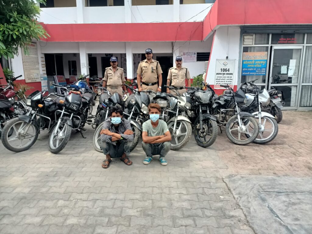 गहनता से पूछताछ करने पर बताया कि हम लोगों ने यह मोटरसाइकिल 40 पी0ए0सी0 के बाहर सडक के किनारे से रात मे चुरायी है। आरोपियों की निशांदेही पर पुरानी कांवड़ पटरी किनारे स्थित खण्डहर से 08 अन्य मोटरसाइकिलें सहित कुल 09 चोरी की मोटरसाइकिल बरामद की गई हैं।