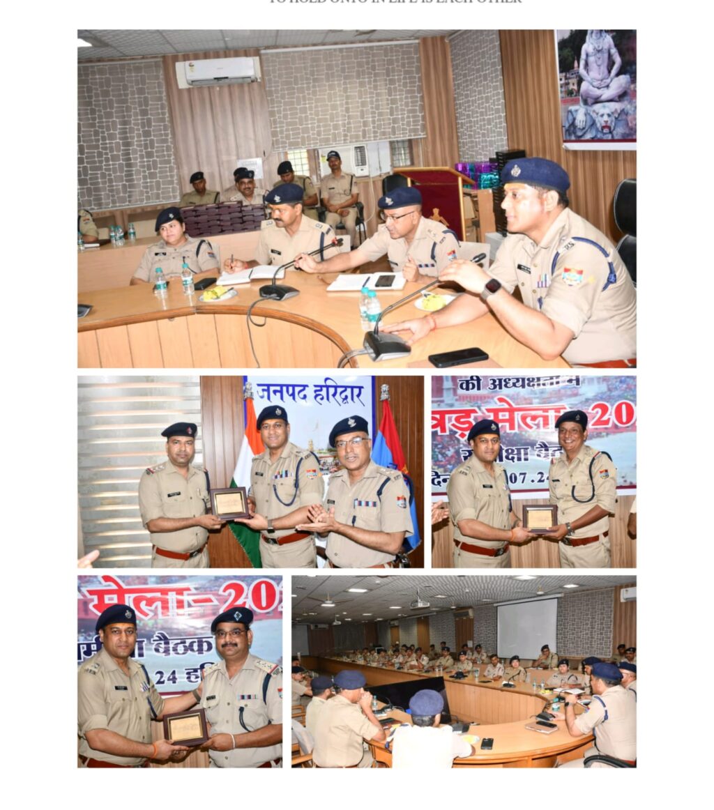 वरिष्ठ पुलिस अधीक्षक द्वारा कहा कि यह मेला हमारे लिए बहुत बड़ी चुनौती था सभी लोगों ने अपनी- अपनी जिम्मेदारी के साथ टीम भावना के साथ इस मेले को निर्मित संपन्न करने में अपना अपना योगदान दिया है सभी लोग बधाई के पात्र हैं यह मेला किसी एक का प्रयास पुलिस एवं प्रशासन की संपूर्ण टीम का फल है हम सभी लोग बहुत खुश हैं कि इस चुनौती में सफल रहे हैंl एसएसपी हरिद्वार द्वारा सभी सुपर जोनल एवं जोनल प्रभारी को कावड़ मेला 2024 मोमेंटो देखकर सम्मानित किया गयाl