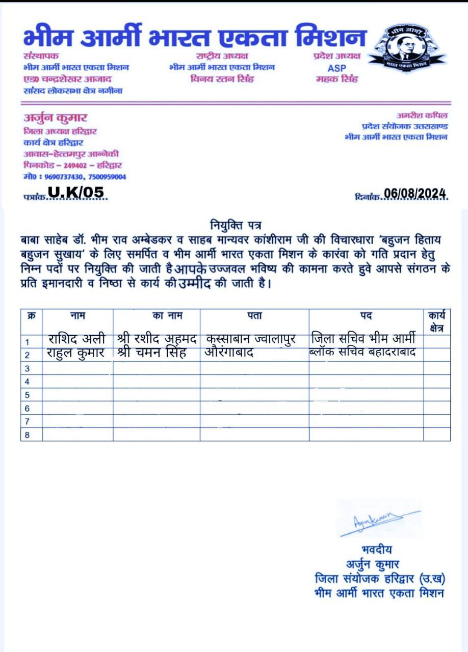 हरिद्वार–जिला अध्यक्ष अर्जुन जी द्वारा राशिद अली को भीम आर्मी भारत एकता मिशन का ( ज़िला सचिव) नियुक्त किया गया। जिस पर पार्टी हाईकमान का आभार व्यक्त करते हुए राशिद अली ने कहा कि संघठन ने उन पर जो विश्वास जताकर उन्हें जिम्मेदारी दी है।