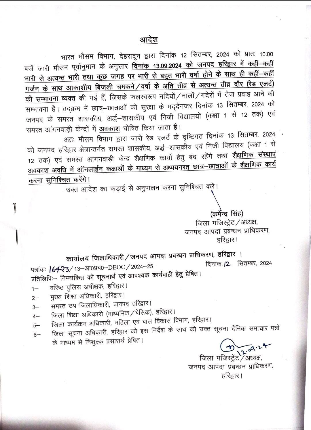 हरिद्वार – उत्तराखंड प्रदेश में मौसम विज्ञान केंद्र ने पूरे प्रदेश में भारी बारिश का जारी किया है। जिसे देखते हुए डीएम कर्मेंद्र सिंह ने हरिद्वार जनपद के सभी सरकारी, गैर सरकारी स्कूल और आंगनबड़ी केंद्र बंद करने का आदेश जारी कर दिया है। हालांकि आदेश में शैक्षणिक संस्थाओं को ऑनलाइन पढ़ाई जारी रखने को भी कहा गया है।