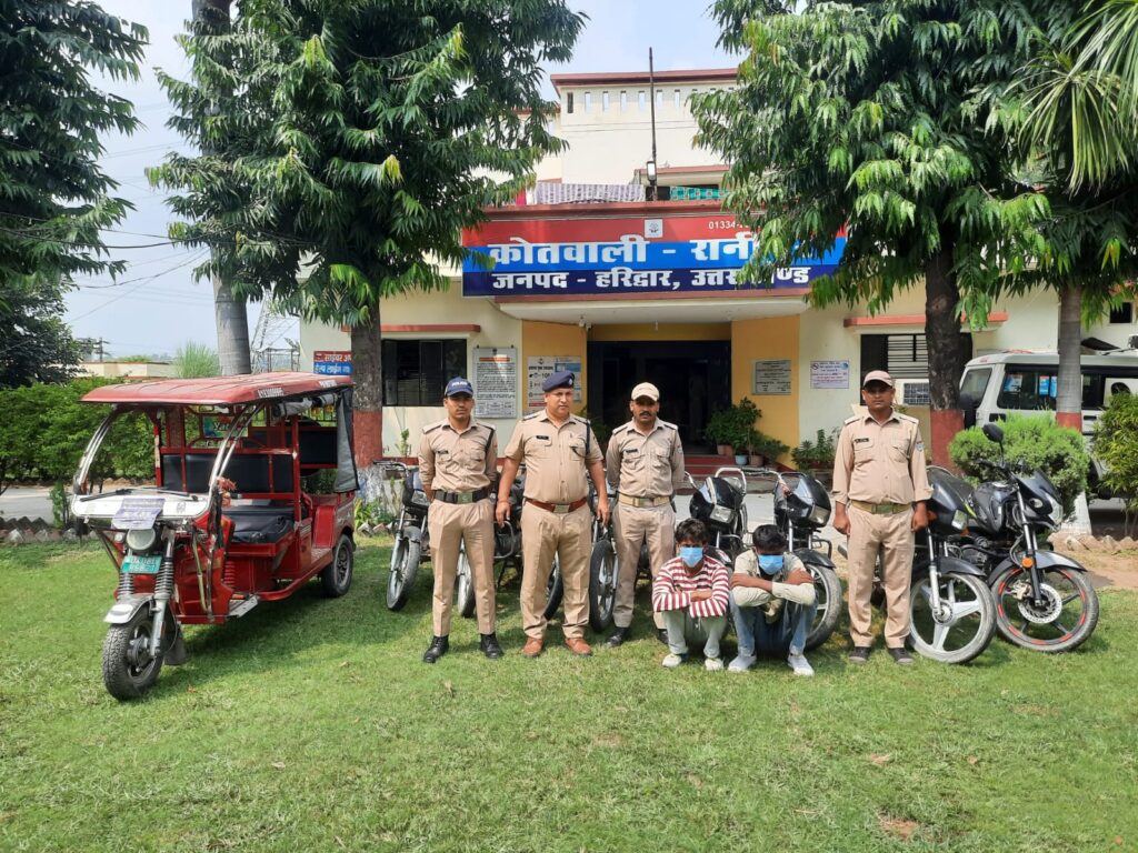 हरिद्वार की रानीपुर कोतवाली पुलिस ने अंतर्राज्यीय वाहन चोर गिरोह के दो सदस्यों को गिरफ्तार किया है। पुलिस ने दोनों से विभिन्न स्थानों से चोरी की आठ बाइकें और एक ई-रिक्शा बरामद की हैं। पकड़े गए आरोपियों में से एक हत्या के प्रयास के मामले में पहले भी जेल जा चुका है।