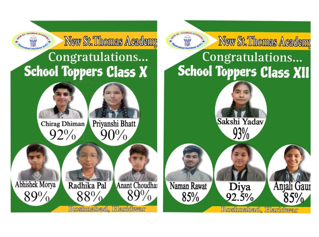 हरिद्वार के रोशनाबाद स्थित न्यू एसटी थॉमस अकेडमी ने सीबीएसई बोर्ड परीक्षा 2024 में कक्षा 10वीं व 12वीं के शानदार परीक्षा परिणामों के साथ एक बार फिर अपनी शैक्षणिक श्रेष्ठता को सिद्ध किया है। विद्यार्थियों ने विभिन्न वर्गों में उत्कृष्ट प्रदर्शन कर विद्यालय को गौरवान्वित किया है।