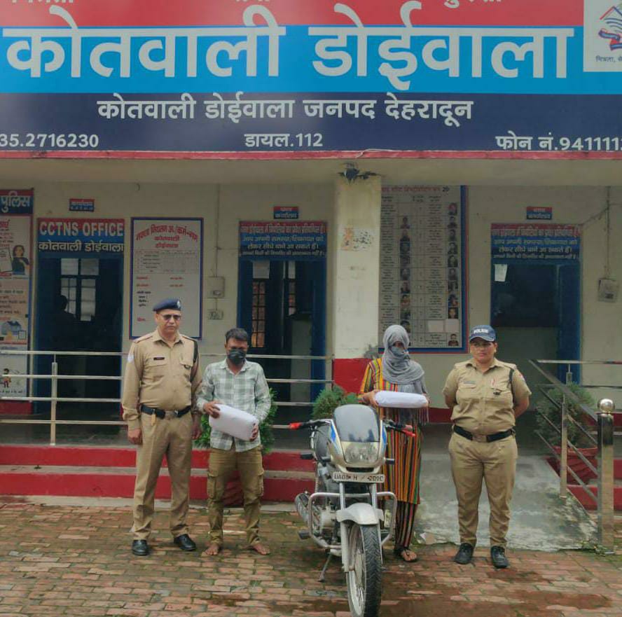 नशा तस्करों पर जारी दून पुलिस की कार्यवाही,अवैध मादक पदार्थ गांजे के साथ 02 नशा तस्करों ( 01 महिला, 01 पुरूष ) को दून पुलिस ने किया गिरफ्तार,अभियुक्तों के कब्जे से भारी मात्रा मे 04 किलो 60 ग्राम अवैध गांजा हुआ बरामद,तस्करी मे प्रयुक्त मोटर साईकिल को पुलिस ने किया सीज।