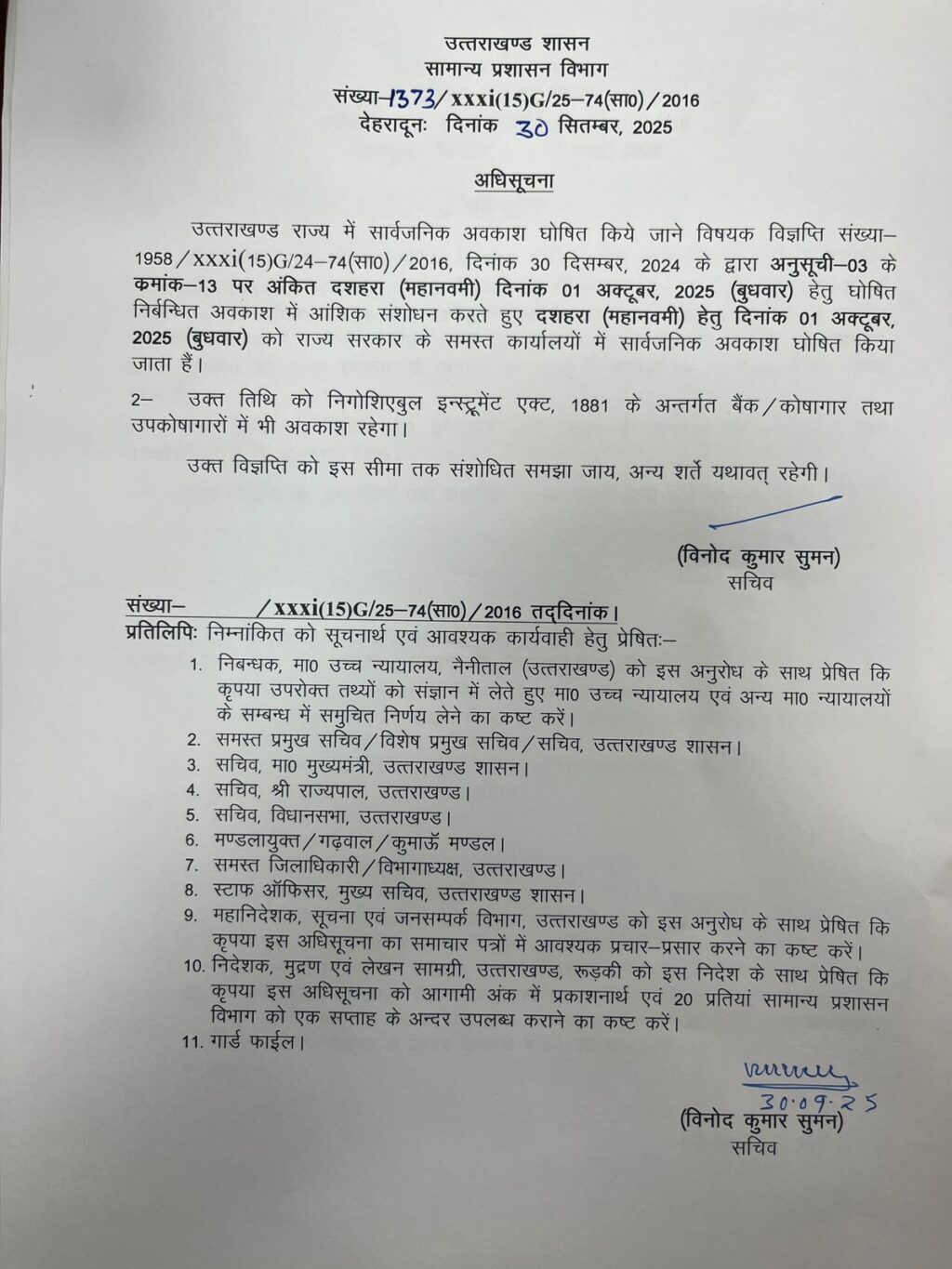 Uttrakhand नवमी अवकाश को लेकर सस्पेंस हुआ खत्म….कल नवमी को सभी सरकारी कार्यालय रहेंगे बंद….सचिव विनोद कुमार सुमन ने जारी किया आदेश…. LIVENEWSTV September 30, 2025 देहरादून। नवमी अवकाश को लेकर सस्पेंस हुआ खत्म। कल नवमी को सभी सरकारी कार्यालय रहेंगे बंद। सचिव विनोद कुमार सुमन ने जारी किया आदेश। Continue Reading Previous पत्नी की हत्या करने वाला पति चढ़ा रानीपुर पुलिस के हत्थे…24 घंटे में भेजा सलाखों के पीछे…लोहे की रॉड से की थी पत्नी की हत्या…नशे की हालत में दिया था घटना को अंजाम…Next जाँच आयोग के अध्यक्ष न्यायमूर्ति ध्यानी ने बीजापुर गेस्ट हाउस में एसआईटी टीम से की मुलाकात… नकल विरोधी कानून के तहत मुकदमें में एसआईटी टीम द्वारा अब तक की गई कार्रवाई के संबंध में ली जानकारी…. Leave a Reply Cancel replyYour email address will not be published. Required fields are marked *Comment * Name * Email * Website Save my name, email, and website in this browser for the next time I comment. More Stories 1 min read Uttrakhand मनसा देवी हिल पहाड़ियाँ पर हो रहे भूस्खलन के उचित प्रबंधन को, उत्तराखंड भूस्खलन न्यूनीकरण एवं प्रबंधन केंद्र की टीम ने किया स्थलीय निरीक्षण… February 4, 2026 LIVENEWSTV Uttrakhand एक दिन एक घंटा एक साथ थीम पर 7 फरवरी को जनपद में चलाया जाएगा मेगा सफाई अभियान… तीर्थ नगरी को साफ स्वच्छ बनाने के लिए डीएम मयूर दीक्षित है निरंतर प्रयासरत… February 4, 2026 LIVENEWSTV 1 min read Uttrakhand नशा तस्करों के विरुद्ध ज्वालापुर पुलिस की कार्रवाई लगातार जारी… अवैध गांजे के साथ दबोचा एक नशा तस्कर…एसएसपी के निर्देश पर चलाए जा रहें अभियान में मिली कामयाबी… February 4, 2026 LIVENEWSTV