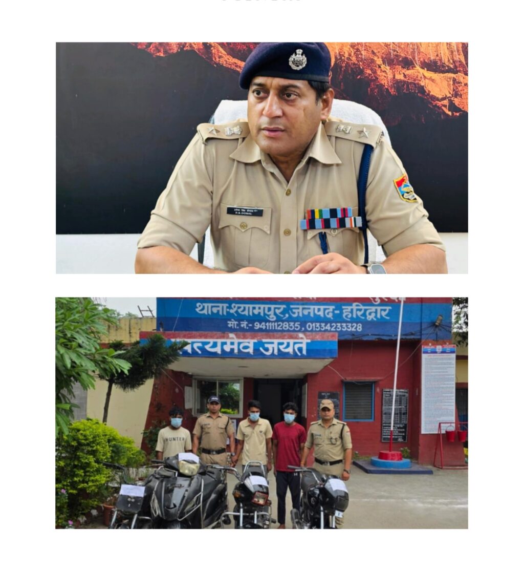 थाना श्यामपुर,हरिद्वार पुलिस ने 24 घण्टे के भीतर वाहन चोरी की घटना का किया सफल अनावरण,03 अन्तर्राज्जीय वाहन चोरों को पुलिस ने धर दबोचा,आरोपियों के कब्जे से चोरी के 04(3 मो0सा0 ,01स्कूटी) वाहन बरामद,आरोपियों की निसादेही पर पूर्व में चोरी की गई दुपाहिया वाहनों को भी किया बरामद।