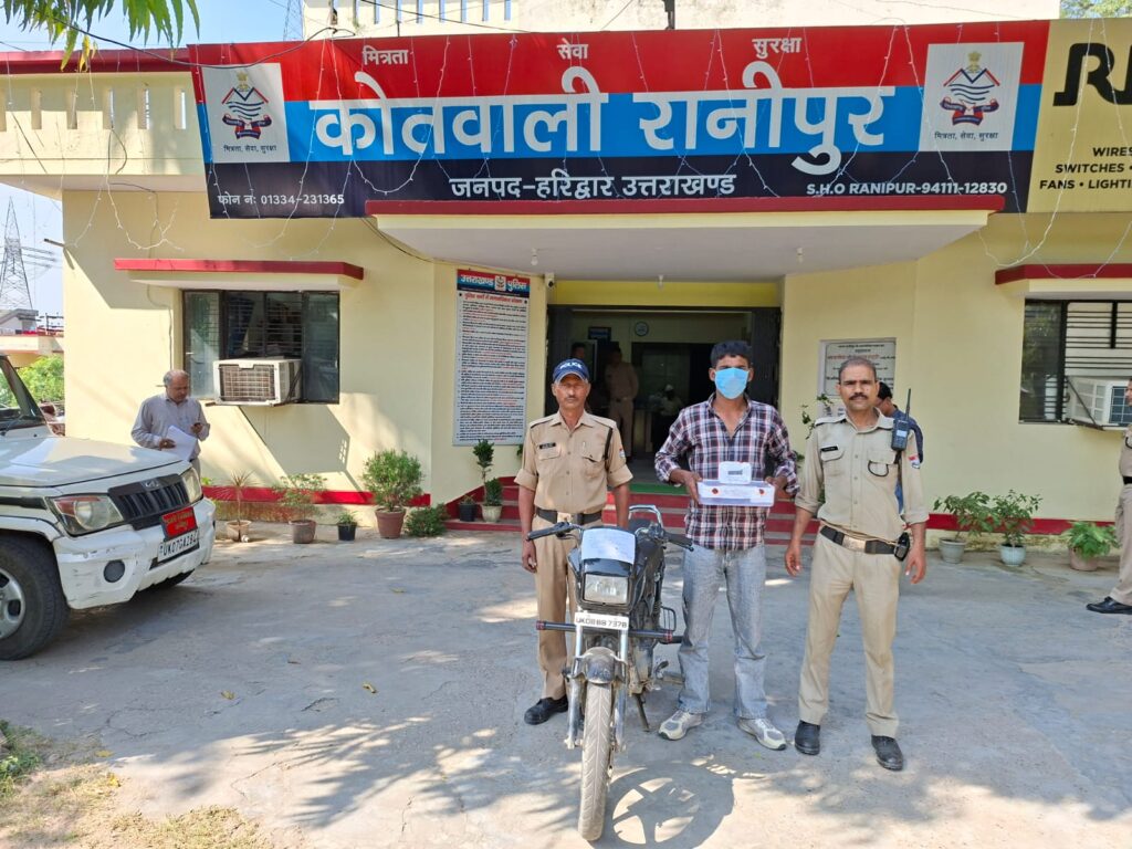 कोतवाली रानीपुर,त्योहारी सीजन के बीच सतर्क हरिद्वार पुलिस को लगातार मिल रही सफलता,रानीपुर पुलिस व सीआईयू टीम की संयुक्त कार्रवाई,अंतर्जनपदीय शातिर चैन स्नैचर दबोचा, स्नैचिंग की 02 वारदातों से उठाया पर्दा,एक ही दिन में दिया था मोबाइल व चैन स्नैचिंग की वारदात को अंजाम,घटना में प्रयुक्त बाइक, चैन का टुकड़ा व तमंचा कारतूस बरामद,छीना हुआ मोबाइल व चैन का टुकड़ा अपने साथी को बेच, बचे चैन के टुकड़े को बेचने निकला था आरोपी,वारदात के दौरान राहगीरों को डराने धमकाने के लिए रखता था तमंचा।