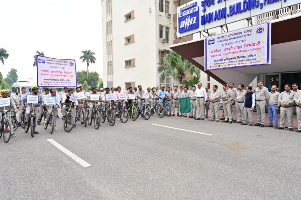 सार्वजनिक जीवन में ईमानदारी तथा सत्यनिष्ठा को बढ़ावा देने के उद्देश्य से, बीएचईएल हरिद्वार में सतर्कता जागरूकता सप्ताह – 2025 मनाया जा रहा है । इस वर्ष के सतर्कता जागरुकता सप्ताह की विषयवस्तु है “सतर्कता: हमारी साझा जिम्मेदारी” । इस उपलक्ष्य में भ्रष्टाचार के विरूद्ध जागरूकता फैलाने के उद्देश्य से, एक साइकिल रैली ‘साइक्लोथॉन’ का आयोजन किया गया । बीएचईएल हरिद्वार के महाप्रबंधक एवं प्रमुख श्री रंजन कुमार ने हरी झंडी दिखाकर रैली को रवाना किया ।