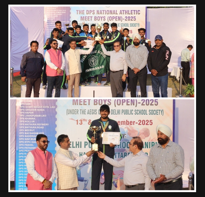 डीपीएस फरीदाबाद ने जीता द डीपीएस नेशनल ऐथलेटिक्स मीट ब्यॉज 2025 विजेता का खिताब डीपीएस रांची दूसरे तथा डीपीएस आर के पुरम रहे तीसरे स्थान पर।