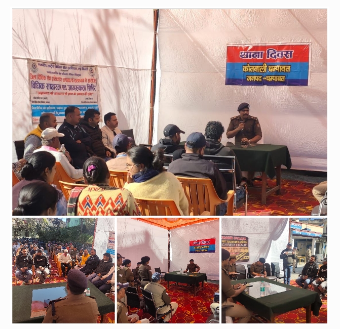 आज दिनाँक 16/11/2025 को कोतवाली चम्पावत में *श्री अजय गणपति पुलिस अधीक्षक चम्पावत* की अध्यक्षता में *थाना दिवस* का आयोजन किया गया। आयोजित थाना दिवस में *पुलिस अधीक्षक महोदय चम्पावत* द्वारा आम नागरिकों की समस्याओं के शीघ्र निस्तारण हेतु प्रभारी निरीक्षक कोतवाली चम्पावत को निर्देशित किया तथा कुछ प्रकरणों का शीघ्र समाधान करने हेतु आश्वासन दिया गया। इस दौरान उपस्थित व्यक्तियों को यातायात के नियमों, साइबर अपराध के बचाव, नशा मुक्ति, घरेलू हिंसा, महिला उत्पीड़न, बाल विवाह एवं महिला अपराध, एवं नवीन कानून के सम्बन्ध में जानकारी देकर जागरूक किया गया। *इसके अतिरिक्त हेल्पलाइन no 112,1090,1930,1098 के सम्बन्ध में विस्तृत जानकारिया दी गयी।*