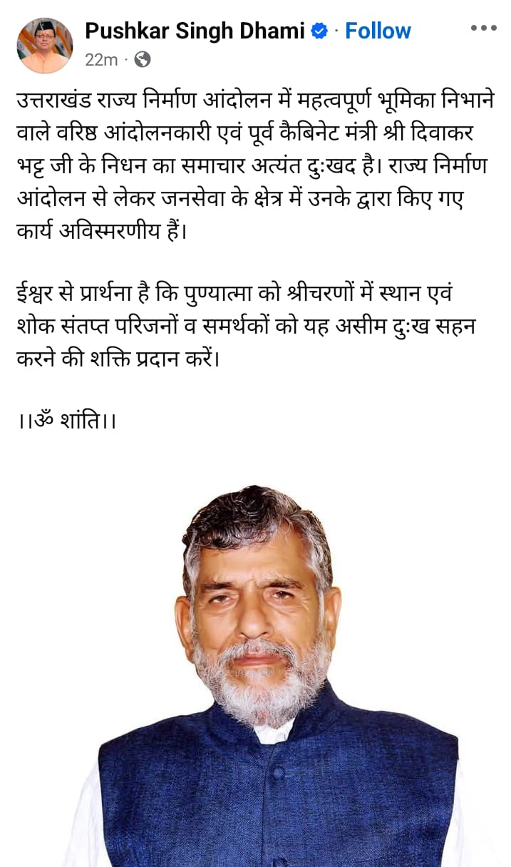 मुख्यमंत्री श्री पुष्कर सिंह धामी ने वरिष्ठ राज्य आंदोलनकारी एवं पूर्व कैबिनेट मंत्री श्री दिवाकर भट्ट के निधन पर गहरा दु:ख व्यक्त किया है।