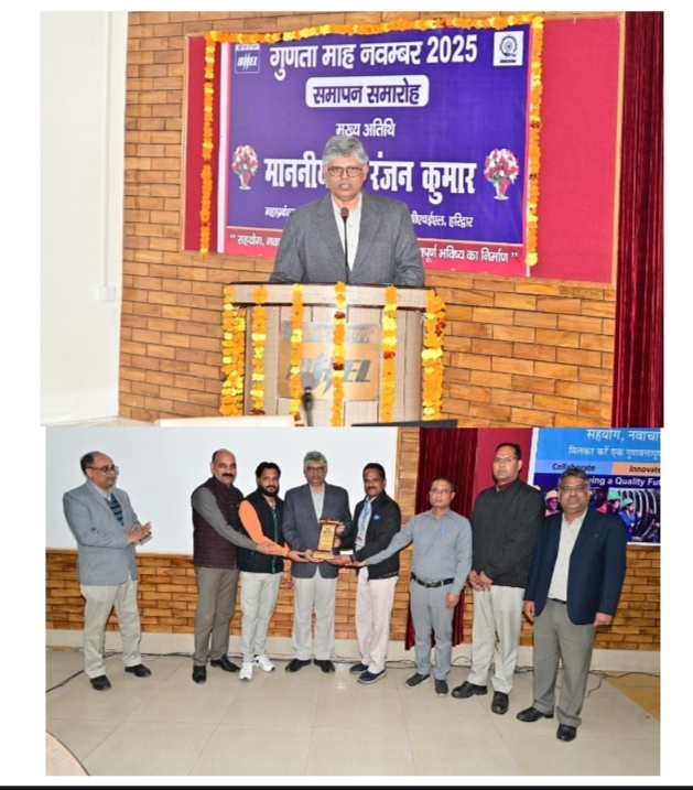 हरिद्वार, 29 नवम्बर : बीएचईएल हरिद्वार में गुणता माह का समापन एक भव्य समारोह के साथ हुआ । समारोह के मुख्य अतिथि महाप्रबंधक एवं प्रमुख श्री रंजन कुमार थे । इस वर्ष के गुणता माह की थीम थी “सहयोग, नवाचार, उत्कृष्टता – मिलकर करें एक गुणवत्तापूर्ण भविष्य का निर्माण” ।