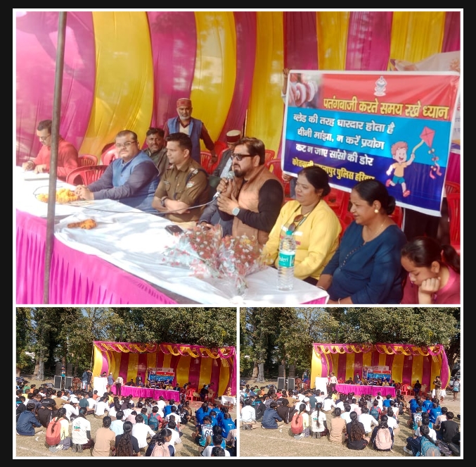 दिनांक 29-11-2025 को वरिष्ठ पुलिस अधीक्षक, हरिद्वार के आदेश के अनुपालन में प्रभारी निरीक्षक कोतवाली ज्वालापुर के निर्देश पर कोतवाली ज्वालापुर क्षेत्र के राजकीय इण्टर कालेज ज्वालापुर में द्वारा जनजागरुकता कार्यक्रम के दौरान बैनर लगाकर चाईनीज मांझे के दुष्प्रभाव व उससे होने वाली दुर्घटनाओं के सम्बन्ध में स्कूल के छात्रा – छात्राओं व अन्य आम नागरिको को सम्बोधित किया गया। उक्त जनजागरुकता कार्यक्रम के दौरान स्थानीय पार्षद, राजकीय इण्टर कालेज ज्वालापुर के प्रधानाचार्य तथा अन्य जन प्रतिनिधि मौजूद रहे।