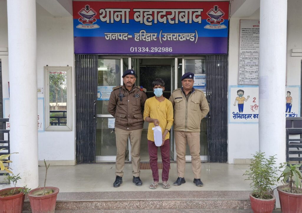 थाना बहादराबाद, नशा मुक्त देवभूमि मिशन को सफल बनाने की दिशा में हरिदद्वार पुलिस की कार्रवाई, कच्ची शराब की तस्करी करने वाला गिरफ्तार, 05 लीटर अवैध कच्ची शराब बरामद।