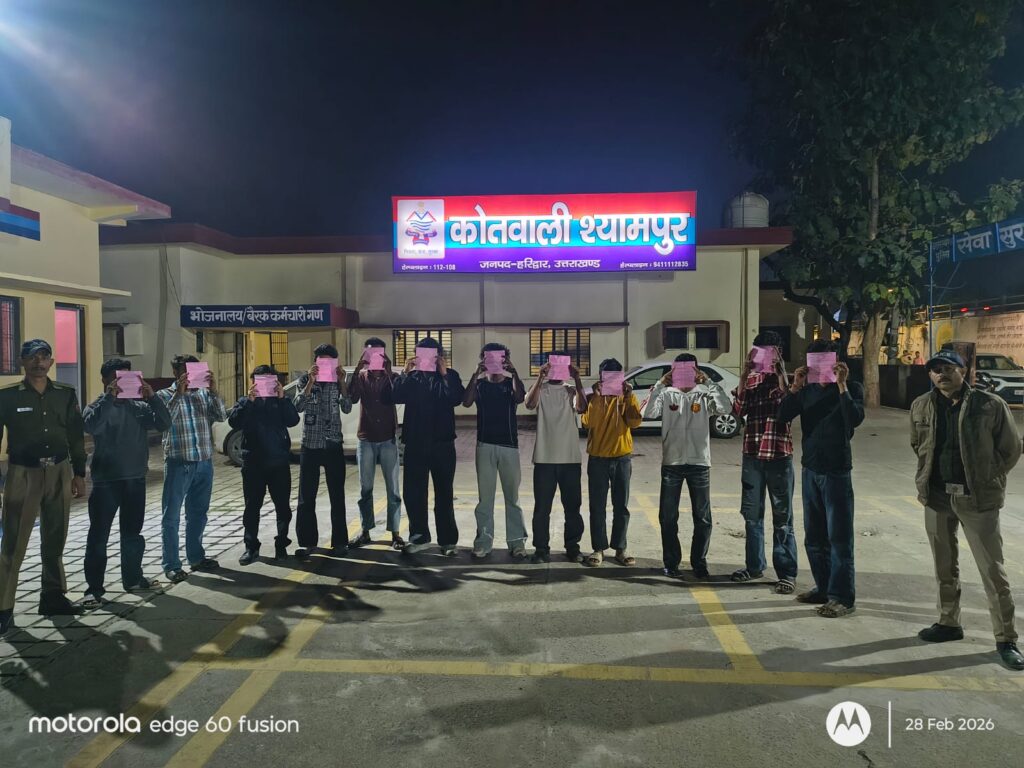 उक्त निर्देश के क्रम में कोतवाली श्यामपुर पुलिस ने चैकिंग/सत्यापन कार्यवाही के दौरान 12 व्यक्तियों को ग्राम गाजीवाली बाजार में एकत्र होकर लड़ाई-झगडा कर शान्ति व्यवस्था भंग करने के जुर्म में धारा 172(2) BNSS में हिरासत लेकर भविष्य में हुड़दंग नहीं किए जाने की हिदायत देते हुए पुलिस एक्ट में जुर्माना किया गया।