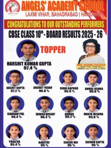 एंजिल्स एकेडमी बहादराबाद का कक्षा 10वीं का सीबीएसई बोर्ड 2025-2026 का परिणाम हुआ घोषित, छात्र-छात्राओं ने उत्कृष्ट प्रदर्शन कर विद्यालय का नाम किया रोशन…प्रिंसिपल रश्मी चौहान और समस्त अध्यापक और अध्यापिकाओं ने बच्चों दी शुभकामनाएं…
