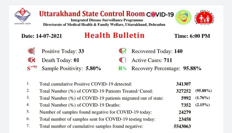 तनवीर अली हरिद्वार प्रदेश में कोरोना वायरस के मामले तेजी के बाद अब घटने शुरू हो गई हैं। आज बुधवार को 33 नए मामले सामने आए हैं, जबकि संक्रमण से 01 की मौत हुई है। प्रदेश में अब संक्रमित मरीजों की संख्या बढ़कर 341307 हो गई है। हालांकि इनमें से 327252 पूरी तरह से स्वस्थ हो चुके हैं। आज 711 मामले एक्टिव हैं, जबकि 7352 की मौत हो चुकी है। आज ठीक हुए मरीजों की संख्या 140 रही।