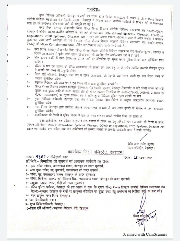 बड़ी खबर …देहरादून जनपद में लगाया गया लॉकडाउन,FRI और तिब्बती कॉलोनी सहस्त्रधारा रोड क्षेत्र लॉकडाउन घोषित,कोरोना संक्रमित व्यक्तियों के पाए जाने के बाद डीएम देहरादून ने किए आदेश जारी,लॉकडाउन जोन के भीतर सभी गतिविधियां की गई प्रतिबंधित।