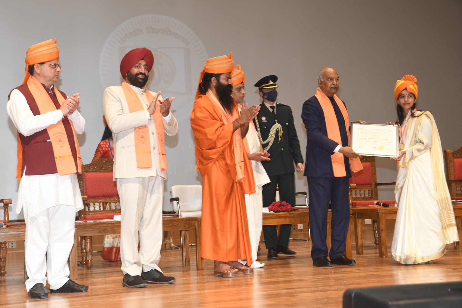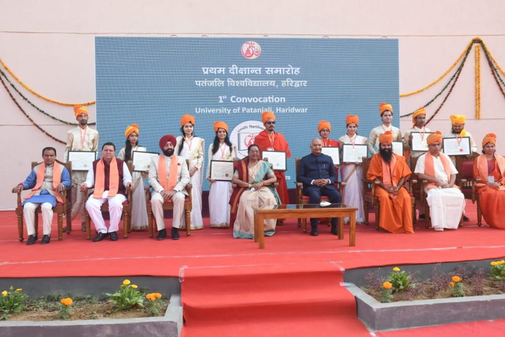 हरिद्वार। महामहिम राष्ट्रपति राम नाथ कोविन्द ने पतंजलि विश्वविद्यालय, हरिद्वार के प्रथम दीक्षांत समारोह में गोल्ड मेडलिस्ट विद्यार्थियों को उपाधि प्रदान की। इस अवसर पर राज्यपाल लेफ्टिनेंट जनरल गुरमीत सिंह (से. नि.), मुख्यमंत्री पुष्कर सिंह धामी, उच्च शिक्षा मंत्री डॉ. धन सिंह रावत, पतंजलि विश्वविद्यालय के कुलाधिपति स्वामी रामदेव, कुलपति आचार्य बालकृष्ण, संकाय अध्यक्षा डॉ. साधवी देवप्रिया भी उपस्थित थे।