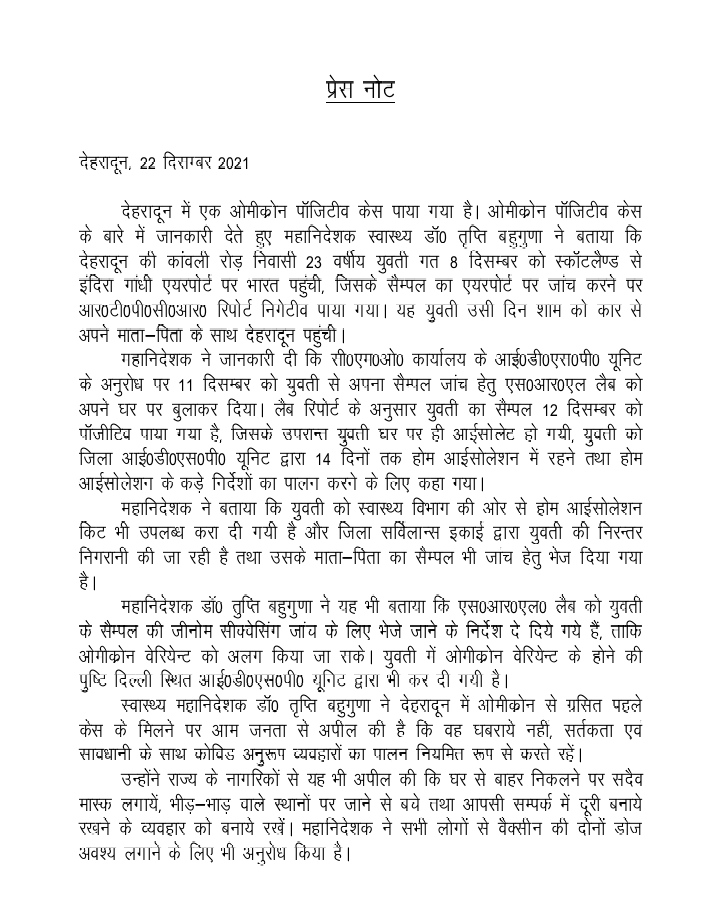 देहरादून में ओमिक्रोन की दत्तक।कांवली रोड़ निवासी 23 वर्षीय युवती में हुई पुष्टि।8 दिसंबर को स्कॉटलैंड से भारत आई युवती। डीजी हेल्थ ने की ओमिक्रोन की पुष्टि।