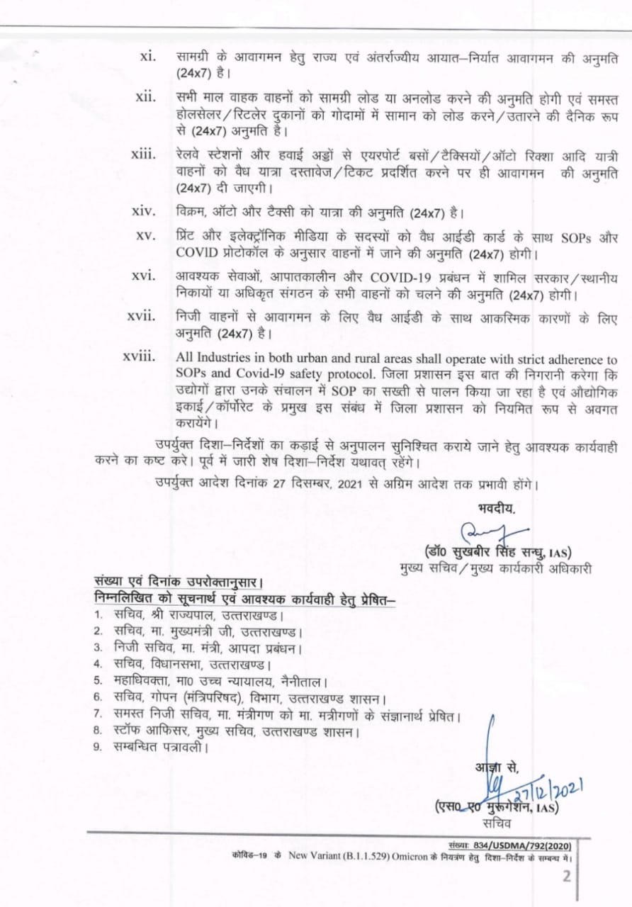 -उत्तराखंड में रात्रि कर्फ्यू के दौरान समस्त स्वास्थ्य सेवाएं 24 घंटे संचालित होंगी। सभी चिकित्सा कर्मियों, पैरामेडिकल स्टाफ और अन्य अस्पताल सहायता सेवाओं के लिए परिवहन की अनुमति होगी।