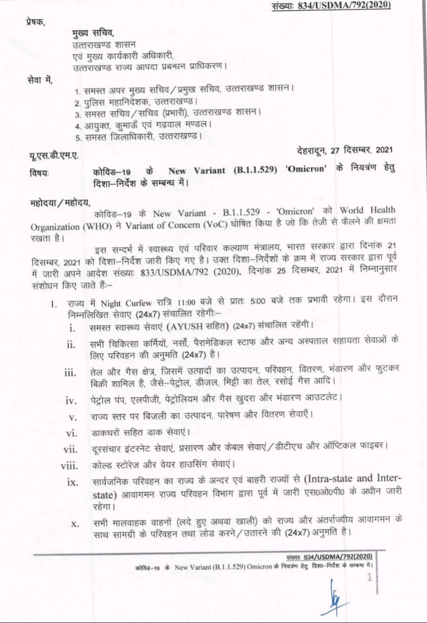 ओमिक्रॉन संक्रमण के मद्देनजर अब उत्तराखंड में रात्रि कर्फ्यू लगा दिया गया है। यह कर्फ्यू 27 दिसंबर से आग्रिम आदेशों तक लागू रहेगा।उत्तराखंड शासन ने आज रात से पूरे प्रदेश के सभी जिलों में नाइट कर्फ्यू लगा दिया है। रात 11:00 बजे से सुबह 5:00 बजे तक नाइट कर्फ्यू रहेगा। शासन ने S.O.P. जारी कर दी है। एसओपी में इन्हें नाइट कर्फ्यू के दौरान अनुमति प्रदान की गई है।