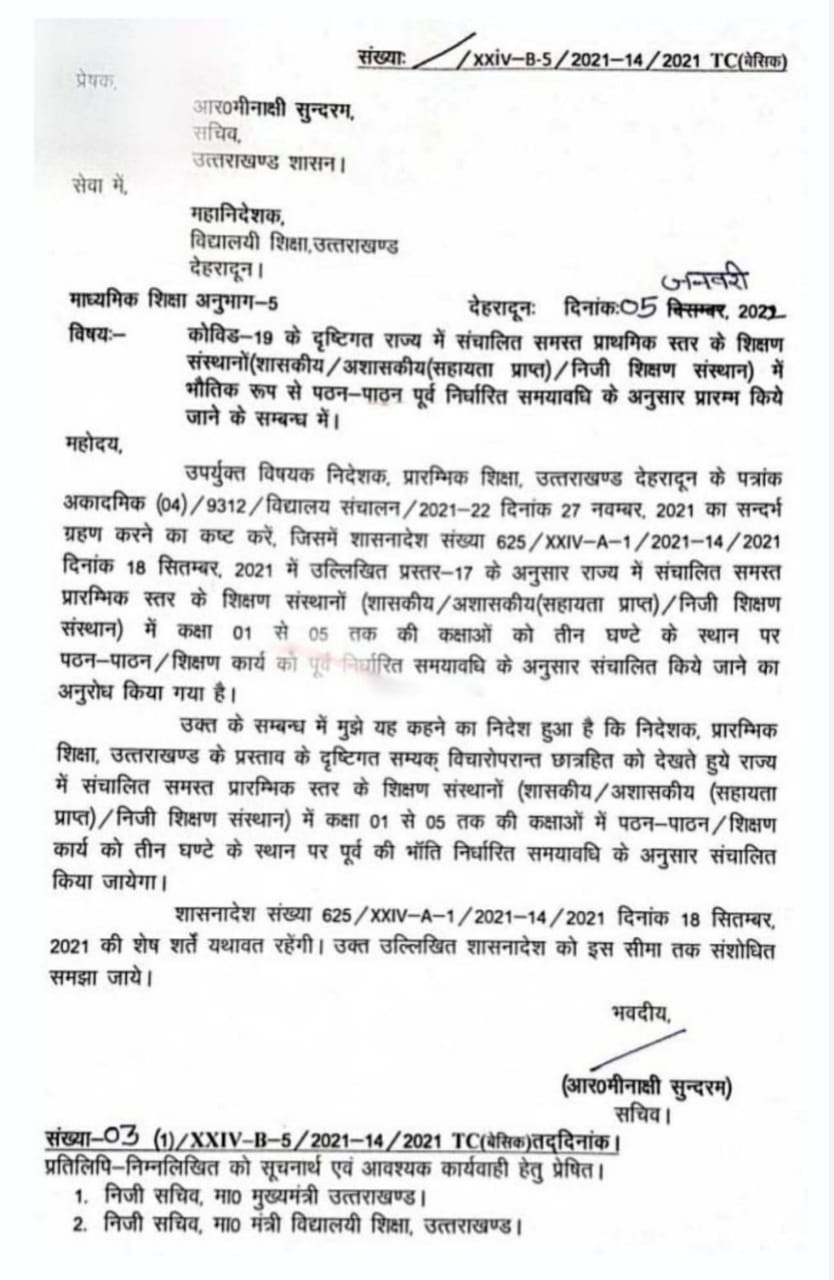 प्रदेश सरकार ने कोरोना के बढ़ते मामलों के बीच उत्तराखंड में पहली से पांचवीं तक सभी कक्षाएं अब पूरा वक्त चलाने के आदेश कर दिए हैं। अभी तक ये कक्षाएं सिर्फ तीन घंटें तक संचालित हो रही थी। बुधवार को सचिव शिक्षा आर मीनाक्षी सुंदरम ने यह आदेश किया है।