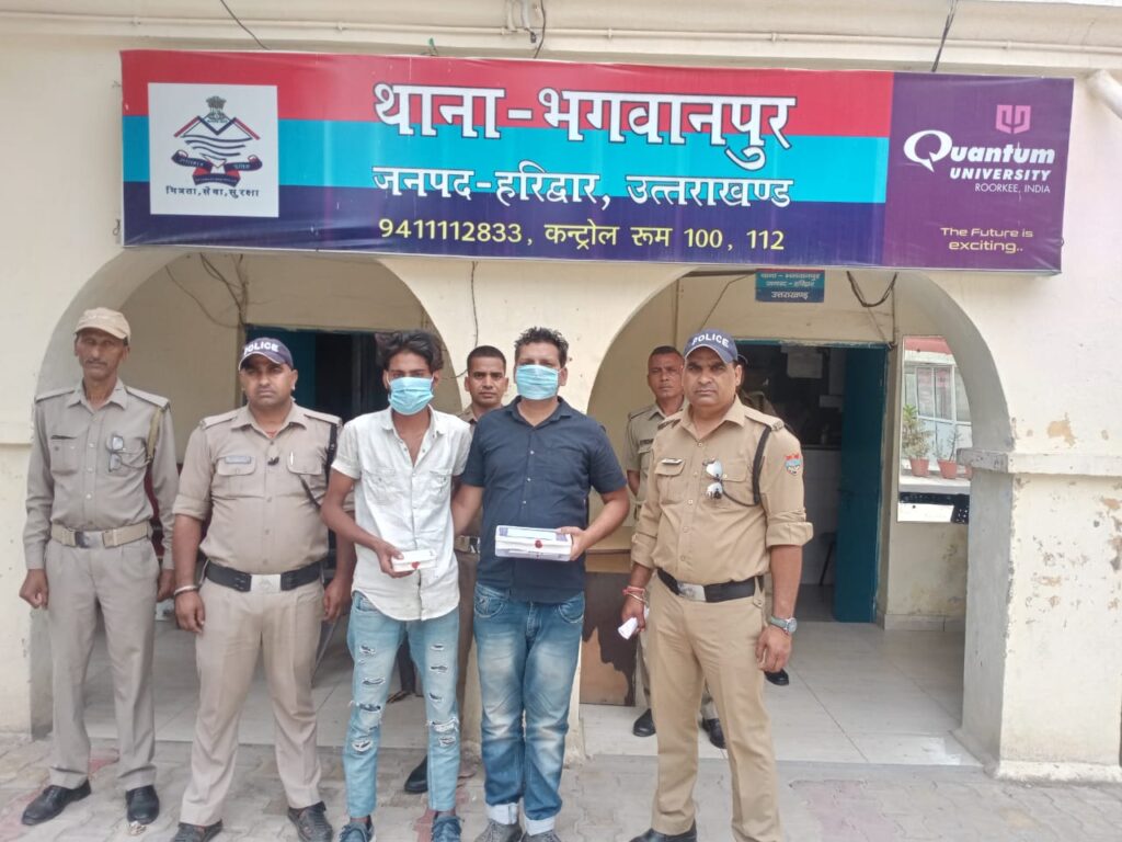 हरिद्वार में श्रीमान पुलिस उपमहानिरीक्षक/वरिष्ठ पुलिस अधीक्षक महोदय व श्रीमान पुलिस अधीक्षक ग्रामीण महोदय के निर्देशन तथा श्रीमान क्षेत्राधिकारी मंगलौर महोदय के कुशल पर्यवेक्षण व प्रभारी निरीक्षक महोदय भगवानपुर के नेतृत्व में अपराधो की रोकथाम/निरोधात्मक कार्यवाही के तहत अलग-अलग टीमो का गठन कर सघन चैकिंग अभियान चलाया गया। दौराने चैकिंग दिनांक 20.06.2022 को देर रात्रि में पुलिस टीम को मुखबिर द्वारा सूचना प्राप्त हुई कि मक्खनपुर सर्विस रोड पर तसोवर वाली गली में दो अजनबी व्यक्ति काफी देर से खड़े हैं, तथा उनके पास एक पिस्टल है जिसको वे लोग लहरा रहे है तथा लोगो को भयभीत कर रहे है जो कोई घटना करने की फिराक में यहां पर खड़े है। परिमाण स्वरूप पुलिस टीम द्वारा मुखबिर की सूचना पर सर्विस रोड से लगभग 15 मीटर अंदर गली में तसोवर के मकान के पास मक्खनपुर भगवानपुर से अभि0गण 1- सचिन पुत्र प्रीतम सिंह निवासी मोहल्ला सराह थाना रामपुर मनिहारान जिला सहारनपुर उत्तर प्रदेश, 2- रमन वर्मा पुत्र पवन कुमार वर्मा निवासी मोहल्ला दरवाजा कला थाना रामपुर मनिहारान जिला सहारनपुर उत्तर प्रदेश को एक अदद पिस्टल लाइसेंसी 07 अदद जिंदा कारतूस व एक अदद शस्त्र लाइसेंस संख्या- 1391 के साथ गिरफ्तार करने में सफलता प्राप्त हुई है। अभि0गणों को माननीय न्यायालय के समक्ष पेश किया जा रहा है।