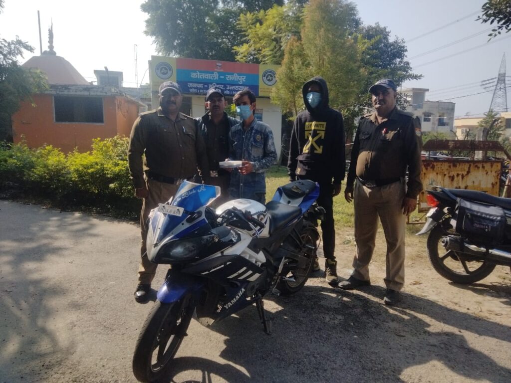 हरिद्वार की रानीपुर कोतवाली क्षेत्र की शिवलोक कालोनी निवासी दीपक पुत्र श्यामलाल की मोटर साईकिल (R-15) न0 UK-14A-1014 व मोबाईल ओप्पो F-19 चोरी होने सम्बन्धित प्रकरण में दर्ज मुकदमें का कोतवाली रानीपुर पुलिस ने खुलासा करने में कामयाबी हासिल की।चोरी की घटना के अनावरण हेतु एसएसपी महोदय हरिद्वार द्वारा दिए गए स्पष्ट एवं कड़े दिशानिर्देशों के क्रम में कोतवाली रानीपुर पुलिस ने दिनांक 10-11-2022 को ठोस सुरागरसी पतारसी के आधार पर अभियुक्त मोहित पुत्र श्यामलाल निवासी नियर होली चौक कनखल व सौरभ वर्मा उर्फ मोनू पुत्र ब्रिजेश वर्मा निवासी नियर होली चौक कनखल को चोरी की गयी मोटरसाइकिल व मोबाईल फोन के साथ पकड़ा गया। 01- SHO रानीपुर रमेश तनवार