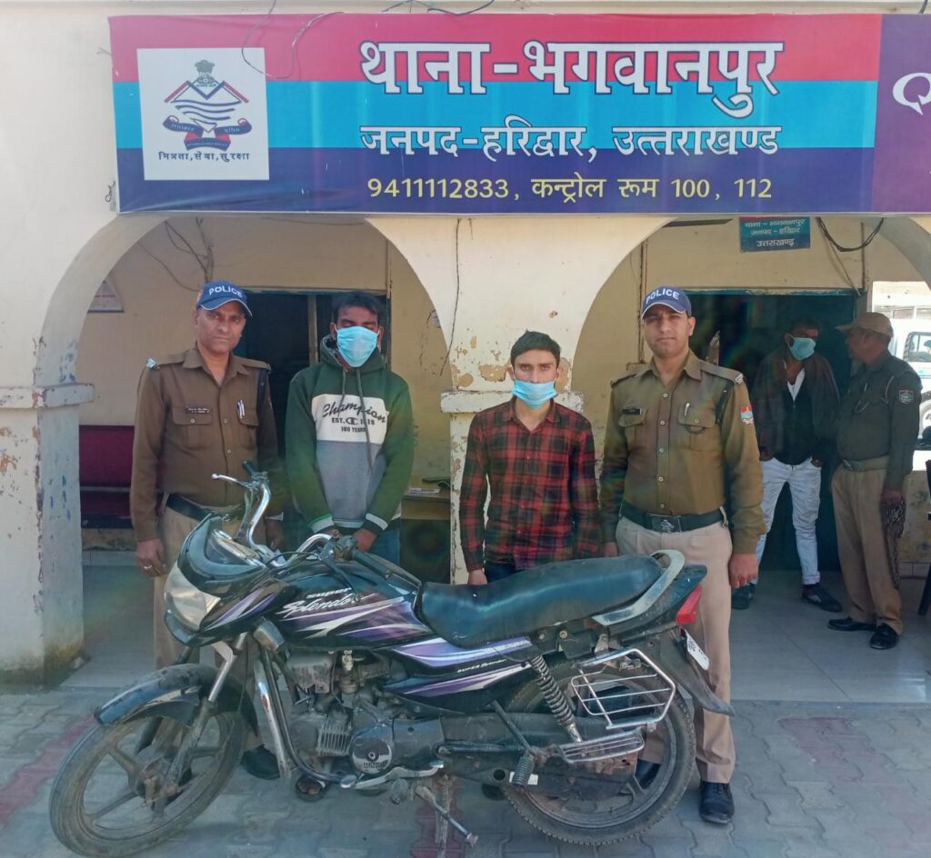 हरिद्वार के भगवानपुर थाना क्षेत्र के पुहाना गाँव के चौक पर स्थित एक कंपनी के ATM में घुसकर तोड़ने का प्रयास करने वाले मतलबपुर गाँव निवासी रवि सैनी और सुनहरा निवासी अभिषेक को पुलिस ने गिरफ्तार कर लिया है। इतना ही नहीं पुलिस ने उनके पास से कलियर से चोरी की गई एक बाइक भी बरामद कर ली है। हांलाकि घटना में शामिल माधव शर्मा और हन्नू शर्मा अभी भी फरार चल रहे है। बता दे की पुहाना निवासी मोहम्मद दौड़ नाम के एक व्यक्ति ने 11 नवम्बर को पुलिस को तहरीर देकर बताया था की पुहाना चौक पर उनकी दूकान है जिसमे एक कंपनी का ATM है। 10 नवम्बर की रात अज्ञात बदमाशो के द्वरा ATM मशीन तोड़ने का प्रयास किया गया है। पुलिस ने तहरीर के आधार पर मुकदमा दर्ज कर लिया था जिसके बाद पुलिस ने मुखबिर की सुचना पर पुहाना के पास से बाइक सवार रवी सैनी और अभिषेक को गिरफ्तार कर लिया है। और उनके पास से कलियर क्षेत्र से चोरी की गई एक बाइक भी बरामद कर ली है। दोनों ने पुलिस को बताया की घटना में उनके साथ माधव शर्मा और हन्नू शर्मा भी शामिल थे पुलिस अब दोनों की तलाश कर रही है। बरामदगी –