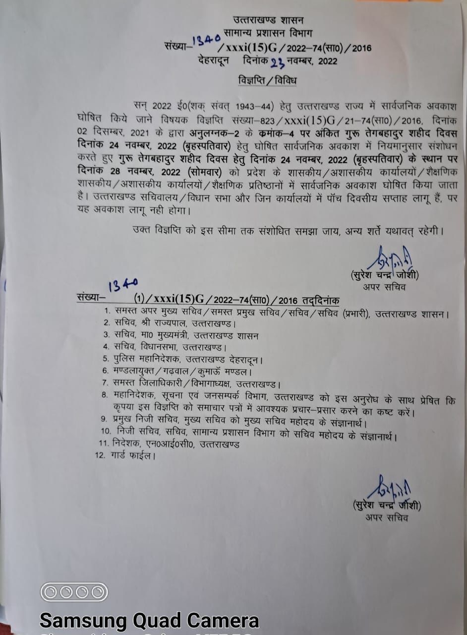 Uttrakhand कल यानी 24 नवंबर को राज्य में नहीं रहेगा सार्वजनिक अवकाश…गुरु तेगबहादुर शहीद दिवस को लेकर अवकाश अब 28 नवंबर को रहेगा…. LIVENEWSTV November 23, 2022 देहरादून।कल यानी 24 नवंबर को राज्य में नहीं रहेगा सार्वजनिक अवकाश।गुरु तेगबहादुर शहीद दिवस को लेकर अवकाश अब 28 नवंबर को रहेगा।अपर सचिव सुरेश चंद्र जोशी ने जारी किए आदेश।जिन कार्यालयों में 5 दिवसीय सप्ताह लागू है उनमें अवकाश नहीं रहेगा। Post navigation Previous एंजेल्स अकैडमी सीनियर सेकेंडरी स्कूल में पाच दिवसीय खेल महोत्सव का भल्ला स्टेडियम देवपुरा में हुआ शुभारंभ…जिला शिक्षा अधिकारी (बेसिक)एसपी सेमवाल मुख्य अतिथि के रूप में हुए शामिल…Next बहादराबाद थाना पुलिस के हाथ लगी कामयाबी….अंतराज्यीय बाइक चोर गिरोह चार सदस्यों को गिरफ्तार कर…..कब्जे से 21 मोटरसाइकिल की बरामद…. Leave a Reply Cancel replyYour email address will not be published. Required fields are marked *Comment * Name * Email * Website Save my name, email, and website in this browser for the next time I comment. More Stories 1 min read Uttrakhand दून पुलिस कप्तान के निर्देशन में नशा तस्करों के मंसूबों को नाकाम करता आपरेशन प्रहार, मादक पदार्थों की तस्करी में लिप्त 01 शातिर अपराधी आया दून पुलिस की गिरफ्त में, लगभग 03 लाख की 8.84 ग्राम अवैध स्मैक की बरामद… April 22, 2026 LIVENEWSTV 1 min read Uttrakhand एक माह के भीतर गुण्ड़ा/ गैगेस्टरों/ इनामी अपराधियों के विरुद्ध हरिद्वार पुलिस की ताबातोड़ कार्यवाही, एसएसपी हरिद्वार के नेतृत्व हरिद्वार पुलिस की आदतन अपराधियों को करेगी तड़ीपार, आदतन अपराधियों पर हरिद्वार पुलिस की कड़ी नजर, संगठित गिरोह बनाकर अपराध करने वालों पर हरिद्वार पुलिस की सर्जिकल स्ट्राइक, April 22, 2026 LIVENEWSTV 1 min read Uttrakhand एसटीएफ,एसओजी व पुलिस टीम के हाथ लगी बड़ी कामयाबी, 25 हजार के इनामी दो बदमाशों को किया गिरफ्तार, कनखल और रानीपुर क्षेत्र में लूट की घटना को दिया था अंजाम… April 22, 2026 LIVENEWSTV