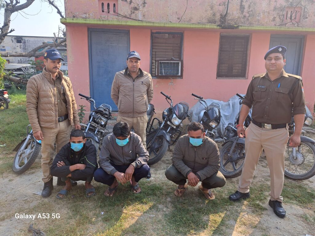 हरिद्वार की लक्सर कोतवाली क्षेत्र के बेगम पुल के पास सुबह तीन बाइक सवार युवकों को धर दबोचा। पूछताछ में युवकों ने स्वीकार किया कि बाइक चोरी की है। इसके आधार पर उनके पास से पुलिस छः चोरी की बाइकें बरामद की।ग्राम अकोढ़ा खुर्द के निवासी आकाश व अनुज तथा थाना भगवानपुर ग्राम मानक माजरा निवासी सागर गुरुवार को सुबह चोरी की मोटरसाइकिल के साथ बेगम पुल सुल्तानपुर आने की सूचना मुखबिर ने पुलिस को दिया। सूचना मिलते ही कोतवाली प्रभारी निरीक्षक यशपाल बिष्ट वरिष्ठ उपनिरीक्षक अंकुर शर्मा उपनिरीक्षक चौकी प्रभारी सुल्तानपुर मनोज नौटियाल उप निरीक्षक नरेंद्र सिंह तोमर कांस्टेबल दीपक ममगई अजीत तोमर अरुण चौहान सुधीर सिंह खजान सिंह हमराहियों संग बेगमपुल के पास पहुंचे। जैसे ही वह तीनों मोटरसाइकिल के साथ आते दिखाई दिए, पुलिस ने तीनो को धर दबोचा। कड़ाई से पूछताछ में छः और मोटरसाइकिल चोरी की घर पर रखने की बात बताया। पुलिस ने तीनों के घर पहुंचकर छः मोटरसाइकिल बरामद किया। सात मोटरसाइकिल और तीनों अभियुक्तों को पकड़कर थाने लाई। पुलिस ने सात मोटरसाइकिल सहित तीनों अभियुक्तों के विरुद्ध मुकदमा दर्ज कर चालान कर दिया।