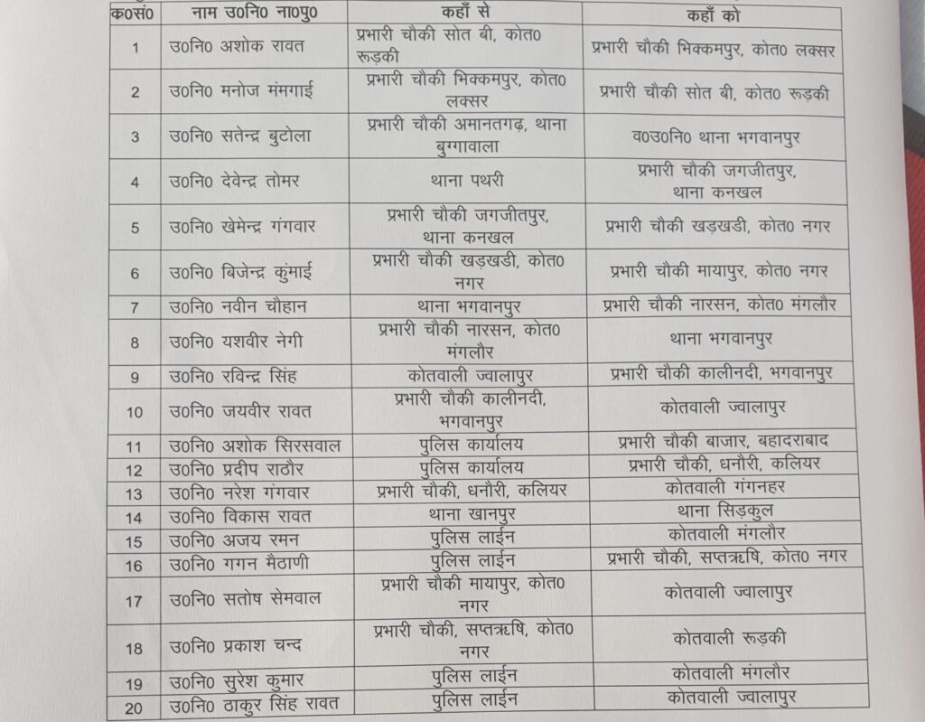 हरिद्वार जनपद में एसएसपी अजय सिंह ने 10 चौकियों के प्रभारियों को बदलते हुए 20 दारोगाओं के कार्यस्थल बदले हैं। जिनमें अशोक रावत को रुड़की की सोत बी चौकी से हटाते हुए भिक्कमपुर चौकी दी है। भिक्कमपुर चौकी पर तैनात मनोज मंमगाई को सोत बी रुड़की चौकी भेजा है। सतेंद्र बुटोला को अमानतगढ़ चौकी से भगवानपुर एसएसआई नियुक्त किया है।