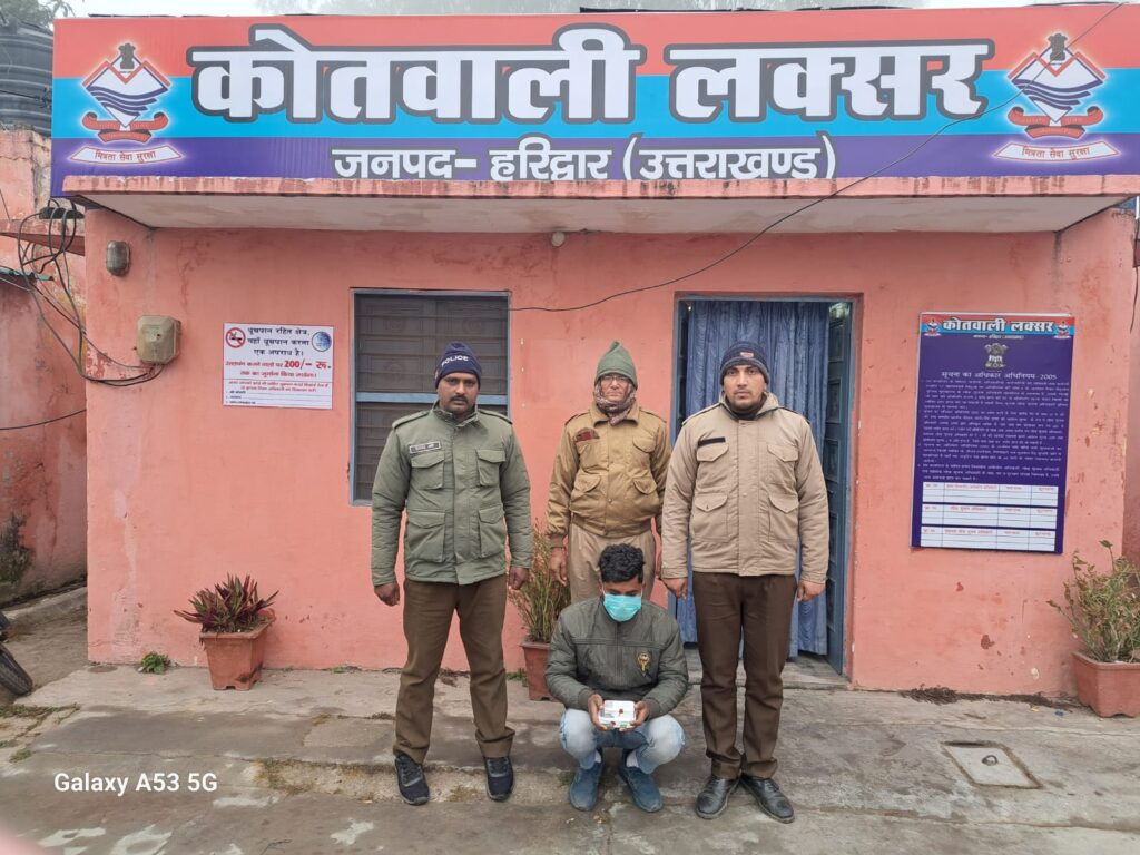 हरिद्वार के लक्सर कोतवाली पुलिस ने एक स्मैक तस्कर को गिरफ्तार किया है। इसके पास से 18.42 ग्राम स्मैक बरामद हुई है। पुलिस ने आरोपी के खिलाफ एनडीपीएस एक्ट के तहत मामला दर्ज कर लिया है। कोतवाली प्रभारी निरीक्षक अमरजीत सिंह के नेतृत्व में पुलिस टीम सोमवार सायं क्षेत्र में वाहन चेकिंग कर रही थी। तभी सुल्तानपुर के पास एक युवक संदिग्ध अवस्था में खड़ा दिखाई दिया।तलाशी लेने पर पुलिस को उसके पास से 18.42 ग्राम स्मैक मैं इलेक्ट्रॉनिक तराजू सहित बरामद हुई। पूछताछ में आरोपी ने अपना नाम शोएब पुत्र गुलशेर ग्राम बसेड़ी खादर कोतवाली लक्सर निवासी बताया। पुलिस के अनुसार पकड़ा गया आरोपी शोएब स्मैक शाहरुख नाम के व्यक्ति से खरीद कर लाया है।जो लंबे समय से स्मैक तस्करी में लिप्त है।पुलिस ने आरोपी के खिलाफ मुकदमा दर्ज किया है। तथा अन्य युवक शाहरुख के बारे में जानकारी में जुटी है।पुलिस टीम में लक्सर कोतवाली प्रभारी निरीक्षक अमरजीत सिंह एसआई मनोज नौटियाल हेड कांस्टेबल खजान सिंह कांस्टेबल गंगा सिंह शामिल रहे।
