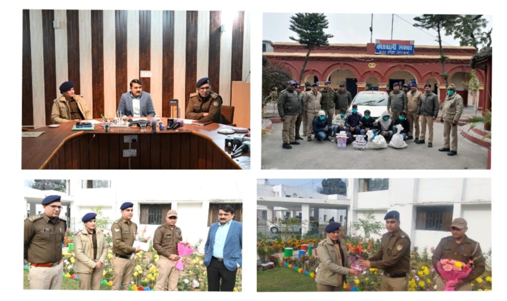 बरामदा माल 01. 03 तमंचे,,,3 नाजायज चाकू,1 मोबाईल कीपैड,,,,2 ए0टी0एम0/डेबिट कार्ड,,,1 वायर कटर छोटा,,,1 प्लास,,,1 टार्च,,,1 वायर कटर बड़ा,,,,1 पिट्ठू बैग व 03 प्लास्टिक के कट्टे,,,एक होन्डा सिटी कार,,,कास्मेटिक्स सामान (हेयर आयल, क्रीम, अण्डर गारमेंट्स, शेविंग रेजर, शेम्पू, फेसवॉश आदि) अनुमानित कीमत करीब ₹25000/-,,,,परचून का सामान (तेल, आटा, सिगरेट आदि) अनुमानित कीमत ₹20000/-,,,4 cctv कैमरे,,,लगभग 300मीटर एल्यूमीनियम आदि…पुलिस टीम में,,,C.O. विवेक कुमार 02. SHO लक्सर अमरजीत सिंह 03. SSI अंकुर शर्मा,,,SI मनोज नौटियाल,,,SI नीरज रावत,,,SI नरेन्द्र तोमर,,,कॉन्स्टेबल पंचम प्रकाश,अजीत तोमर,गंगा सिंह,हमीद खान,अरविन्द चंदेल,होमगार्ड दिनेश कुमार,रविन्द्र कुमार शामिल रहे।