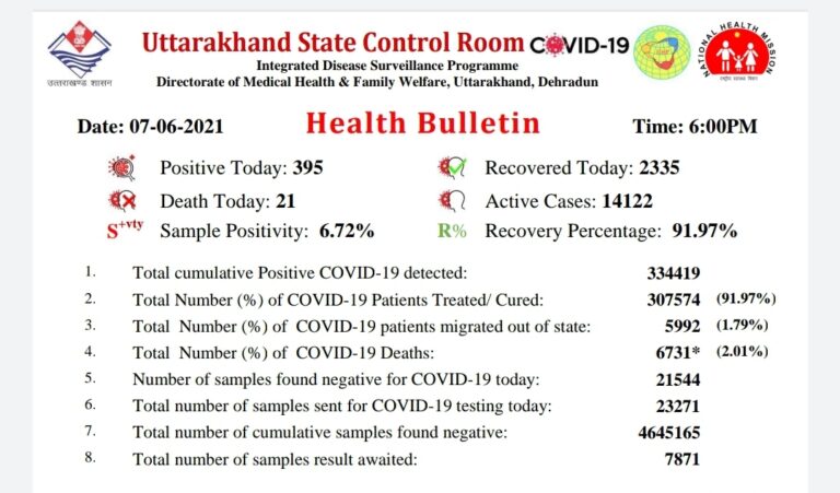 तनवीर अली हरिद्वार:–प्रदेश में कोरोना वायरस संक्रमण के मामले तेजी के बाद अब घटने शुरू हो गए हैं। आज सोमवार को 395 नए मामले सामने आए हैं,जबकि 21 की मौत हुई है। प्रदेश में अब संक्रमित मरीजों की संख्या बढ़कर 334419 हो गई है।हालांकि इनमें से 307574 पूरी तरह से स्वस्थ हो चुके हैं।वर्तमान में 14122 मामले एक्टिव हैं, जबकि 6731 की मौत हो चुकी है।आज ठीक हुए मरीजों की संख्या 2335 रही।इनके अलावा हर जिले में नए मामले 100 से भी कम।