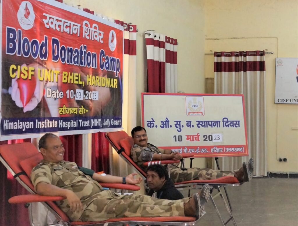 केंद्रीय औद्यौगिक सुरक्षा बल के 54वें स्थापना दिवस पर…. सीआईएसएफ की भेल इकाई द्वारा हिमालयन इंस्टीट्यूट हॉस्पिटल ट्र्स्ट, जॉलीग्रांट के सहयोग से आयोजित रक्तदान शिविर का उद्घाटन… सीआईएसएफ के वरिष्ठ कमांडेंट सत्य देव आर्य ने किया….