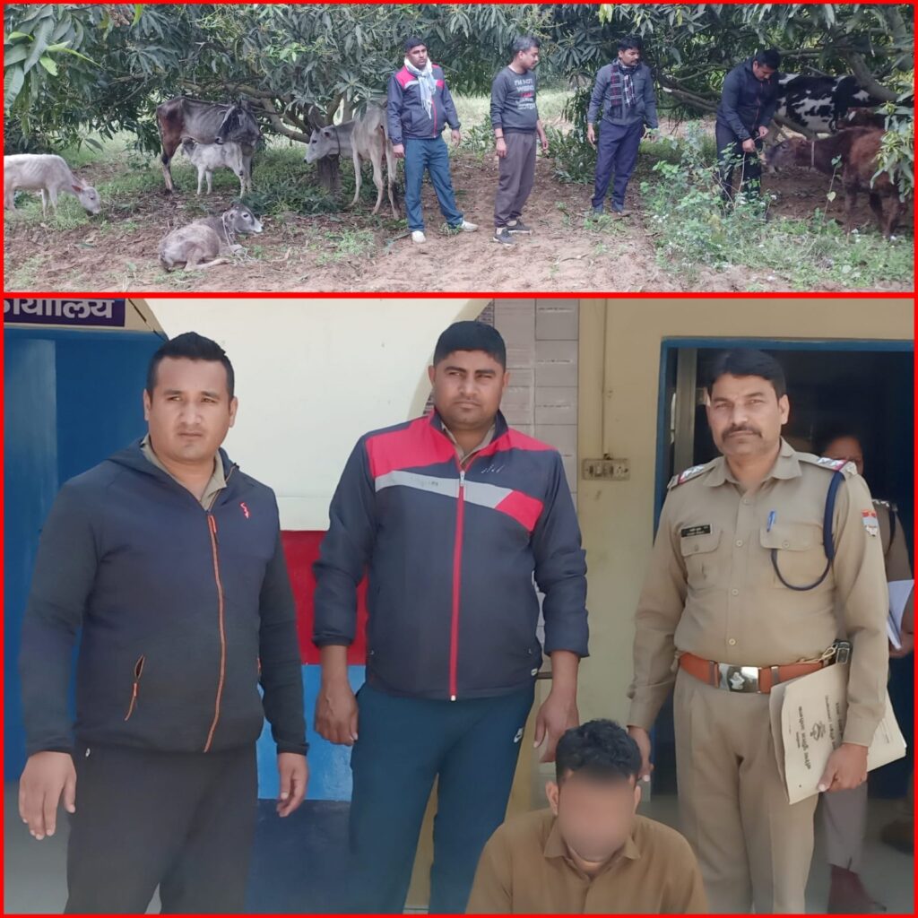 गोकशी के दो अभियुक्त आये पुलिस की गिरफ्त में,मौके से 9 जीवित पशु व गोकशी के उपकरण किये बरामद।
