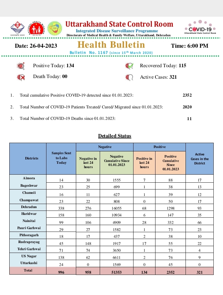 प्रदेश में लगातार बढ़ रहा है कोरोना का ग्राफ,आज राज्य में आए कोरोना के 134 मामले,आज रिकवर हुए मरीजों की संख्या 115,प्रदेश में आज कोरोना संक्रमित मरीज के मौत की कोई पुष्टि नही,प्रदेश में 321 पहुंची एक्टिव कोविड मरीजों की संख्या,1 जनवरी से लेकर अब तक कुल 11 covid मरीजों की हो चुकी है मौत,1 जनवरी से अब तक प्रदेश में कुल 2352 कोरोना के मामले किए गए हैं दर्ज।
