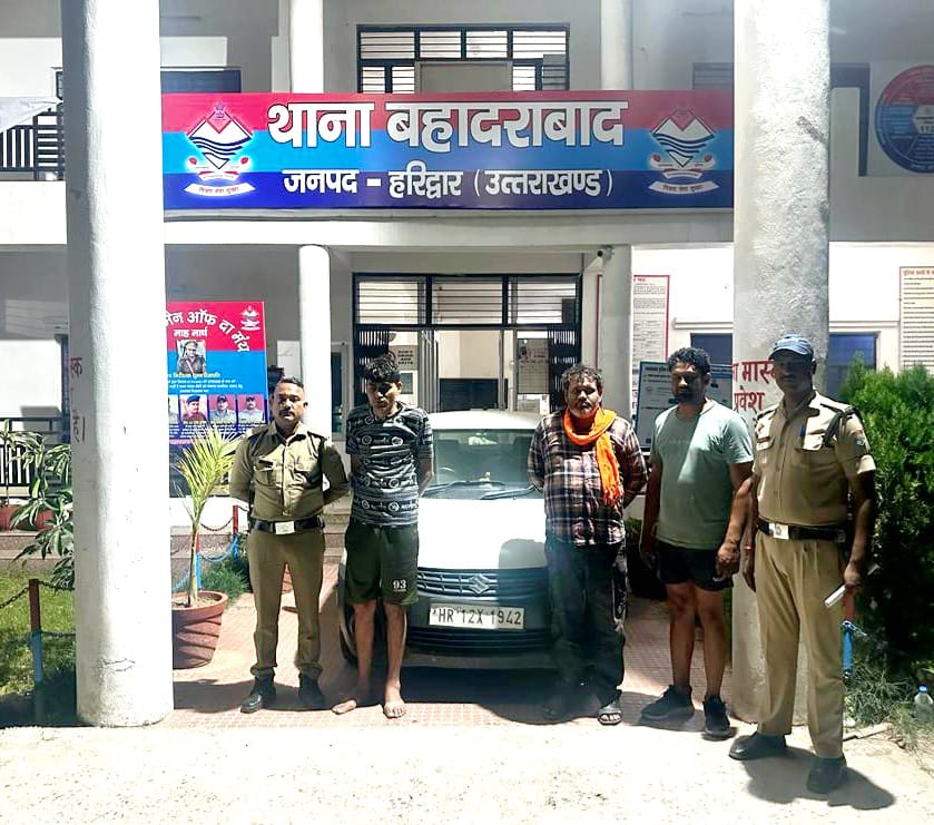थाना बहादराबाद:–प्रचलित चार धाम यात्रा के दृष्टिगत दिनांक 05.05. 2023 को एसएसपी हरिद्वार के आदेशानुसार निरोधात्मक कार्रवाई के क्रम में ख्याति ढाबे के पास वाहन चेकिंग के दौरान वाहन संख्या HR 12X1942 में नशे में तीन अभियुक्तों 1- प्रदीप पुत्र धर्म सिंह निवासी ग्राम बनियानी थाना कलानौर जिला रोहतक हरियाणा उम्र 36 वर्ष 2- कृष्ण पुत्र समुंदर निवासी ग्राम डोब थाना मनभावनपुर जिला रोहतक हरियाणा 3- संदीप पुत्र जगदीश निवासी ग्राम बनियानी थाना कलानूर जिला रोहतक हरियाणा को अंतर्गत धारा 185 MV Act व 81 पुलिस एक्ट के तहत पकड़ कर चालानी कार्रवाई की गई। पुलिस टीम में,SI विजय प्रकाश