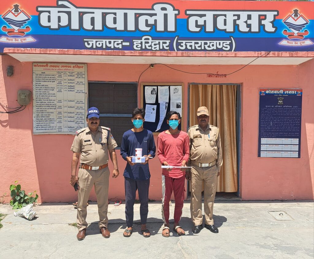 कोतवाली लक्सर,माननीय मुख्यमंत्री उतराखण्ड के “ड्रग्स फ्री देवभूमि मिशन 2025 अभियान’’ के अन्तर्गत उनके मिशन को साकार करने हेतु SSP हरिद्वार द्वारा माद्क पदार्थों की तस्करी करने वाले अभियुक्तों के विरूद्ध कडी कार्यवाही किये जाने हेतु आदेशित किया गया है। उपरोक्त क्रम कोतवाली लक्सर पुलिस द्वारा कार्रवाई करते हुए दिनांक- 09-05-2023 को दौराने चैकिंग मुखबिर खास की सूचना पर खण्डंजा रोड से अभियुक्त आशू उर्फ आश मौहम्मद को 08.5 ग्राम अवैध स्मैक व 01 इलैक्ट्रानिक तराजू व नकदी 1100 रूपये व अवैध चाकू के साथ पकड़ा गया। जबकि उसके साथी समीर उर्फ राजा को अवैध चाकू के साथ पकड़ा गया।गिरफ्तार अभियुक्त,1-आशू उर्फ आश मौहम्मद पुत्र गुलशाद निवासी- ग्राम जैनपुर उर्फ मतलूबपुरा लक्सर कोतवाली लक्सर जिला हरिद्वार,2-समीर उर्फ राजा पुत्र शमशेर निवासी-उपरोक्त,बरामदा माल,1-अवैध स्मैक 08.5 ग्राम,2-इलैक्ट्रानिक तराजू,नकदी 1100 रुपये,अवैध चाकू ,पुलिस टीम में,1- व०उ०नि० अंकुर शर्मा2- का० सोबन,3- का० प्रभाकर शामिल रहें।