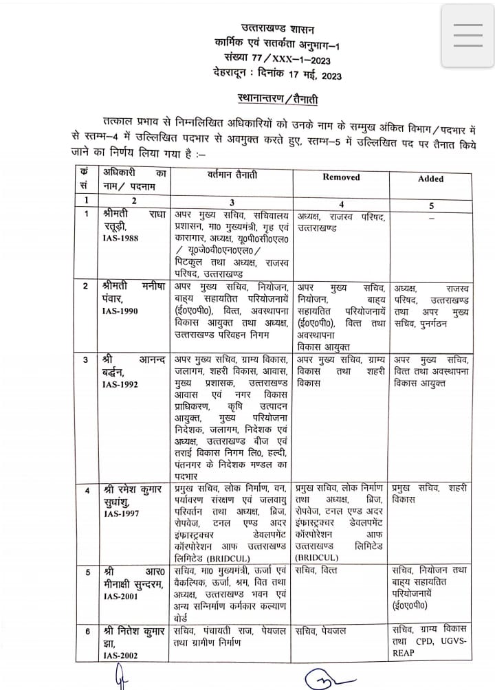उत्तराखंड शासन ने किया बड़ा फेरबदल,24 आईएएस अधिकारी और 1 पीसीएस अधिकारी का किया तबादला।