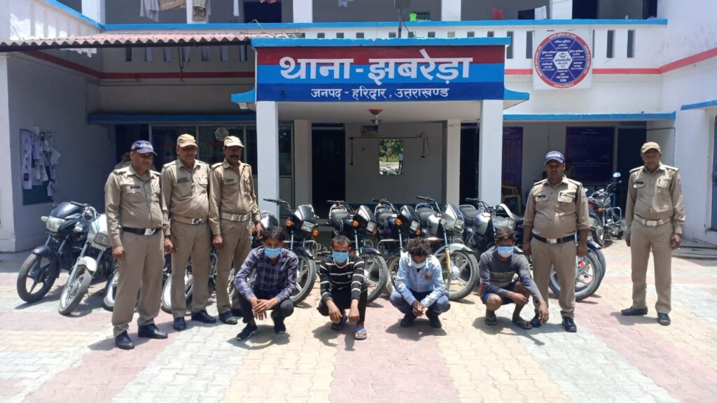 चोरी किए गए वाहनों को बरामद करने व इन घटनाओं में लिप्त विभिन्न गिरोह से पर्दा उठाने के लिए SSP हरिद्वार श्री अजय सिंह के निर्देश पर गठित टीम ने बड़ी कामयाबी हासिल करते हुए दोपहिया वाहनों की चोरी के अभ्यस्त गिरोह के 04 बेहद शातिर सदस्यों को दबोचकर उनके कब्जे से चोरी की 12 मोटरसाइकिलें बरामद की हैं।गुप्त सूचना पर काम करते हुए पुलिस टीम ने कल दिनांक 01.06.2023 को इकबालपुर कुंजा रोड, भट्टे के पास चेकिंग अभियान के दौरान 02 मोटर साईकिल पर सवार 04 संदिग्धों को दबोचा। जिनकी निशांदेही पर ग्राम बेहड़की सहदाबाद से 10 अन्य मोटरसाइकिलें भी बरामद हुईं हैं।कुल 12 मोटरसाइकिलों में 02 थाना झबरेडा से, 03 सिविल लाईन कोतवाली रुडकी से, 01 कोतवाली मंगलौर से, 01 थाना नागल से चुराई गई हैं। शेष 05 की जानकारी की जा रही है। नशे के आदी अभियुक्त उक्त मोटर साइकिलों को सस्ते दामों में बेचकर अपना खर्चा चलाते थे। बरामदगी के आधार पर थाना झबरेडा पर मु0अ0सं0 318/23 धारा 411, 413, 414, 34 भादवि व 41/102 द0प्र0सं0 पंजीकृत किया गया। विवेचना जारी है।
