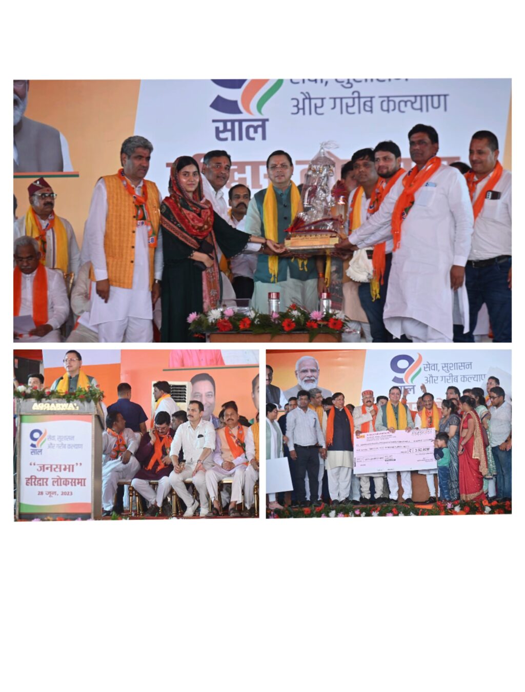 कार्यक्रम को सम्बोधित करते हुये मुख्यमंत्री ने कहा कि हमारी सरकार गरीबों को समर्पित है। गरीब की आवश्यकताओं को भली भांति समझती है इसलिए हमारी सरकार योजनाओं को जन जन तक पहुंचाने के लिए दिन-रात काम कर रही है। इसी का परिणाम है जो आज इतनी बड़ी संख्या में आप सभी यहां एकत्रित हुए हैं। उन्होंने कहा कि देश में पहले जहां शोषितों और वंचितों का तुष्टिकरण होता था, वहीं अब शोषितों और वंचितों का सशक्तिकरण हो रहा है। मुख्यमंत्री ने कहा कि प्रधानमंत्री श्री नरेन्द्र मोदी के कुशल नेतृत्व में पिछले नौ वर्षों के दौरान हुए विकास कार्यों को सभी मापदंडों पर तोलकर हम कह सकते हैं, हमारे देश ने इन 9 वर्षों में हर क्षेत्र में अभूतपूर्व प्रगति की है। आज सारी दुनिया हमारे देश और हमारे यशस्वी प्रधानमंत्री जी का लोहा मान रही है। वर्ष 2014 में देश की जनता ने आदरणीय मोदी जी पर अपना भरोसा जताया था, और आज जनता के इसी भरोसे ने 2014 से 2023 के नौ वर्षों की अवधि में देश की ’’समृद्धि रूपी’’ रेल गाड़ी को ’’विकास रूपी पटरियों’’ पर तेजी से दौड़ाने का कार्य किया है। उन्होंने विश्वास व्यक्त किया कि प्रधानमंत्री जी के नेतृत्व में 2024 से 2029 का समय भारत को पुनः विश्व गुरु बनाने के मार्ग को प्रशस्त करेगा।उन्होंने कहा कि प्रधानमंत्री श्री नरेन्द्र मोदी के नेतृत्व वाली केंद्र सरकार द्वारा स्वास्थ्य से लेकर शिक्षा तक, निःशुल्क खाद्यान्न से लेकर निशुल्क इलाज तक, किसानों के विकास से लेकर गरीबों के आवास तक, सेना के आधुनिकीकरण से लेकर सीमाओं की सुरक्षा तक, प्रत्येक नागरिक को वैक्सीन पहुंचाने से लेकर हथियार और मोबाइल उत्पादन तक हर क्षेत्र में अभूतपूर्व कार्य किये हैं। प्रधानमंत्री जी के नेतृत्व में सरकार ने विभिन्न रोजगार मेलों का आयोजन कर दस लाख लोगों को रोजगार देने का कार्य भी प्रारंभ किया है। तीन तलाक का खात्मा, धारा 370 जैसे काले कानून की समाप्ति, अयोध्या में भगवान श्रीराम के भव्य मंदिर का निर्माण,काशी विश्वनाथ के भव्य कॉरिडोर निर्माण, बद्रीनाथ और केदारनाथ धामों का पुनर्निर्माण ये कुछ ऐसे महत्वपूर्ण कार्य हैं जिनको आने वाली पीढ़ियां भी हमेशा याद रखेंगी।उन्होंने कहा कि पिछले 9 वर्षों में प्रधानमंत्री श्री नरेन्द्र मोदी की मजबूत इच्छाशक्ति के बल पर देश में आतंकवादी, नक्सलवादी और उग्रवादी गतिविधियों में भी उल्लेखनीय कमी आई है। आज भारत दुनिया की पांचवी सबसे बड़ी अर्थव्यवस्था बन गया है और हमारे द्वारा प्रारंभ की गई न्च्प् जैसी कई योजनाओं को पश्चिमी देश हाथों हाथ ले रहे हैं। प्रधानमंत्री जी से प्रेरणा पाकर और उनके ही मार्गदर्शन में, उत्तराखंड में भी विकास के एक नए युग का सूत्रपात हो चुका है। प्रधानमंत्री जी द्वारा हम पर दिखाए