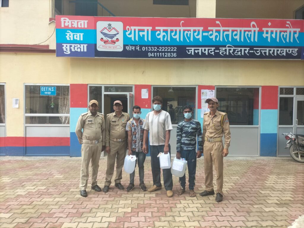 माननीय मुख्यमंत्री उत्तराखंड द्वारा ड्रग्स फ्री देवभूमि 2025 के तहत जनपद को नशा मुक्त करने व नशा (अवैध शराब/स्मैक/ चरस/ गांजा आदि) तस्करों के विरुद्ध हरिद्वार पुलिस द्वारा चलाये जा रहे अभियान को सफल बनाने के क्रम में एसएसपी हरिद्वार द्वारा ड्रग्स फ्री देवभूमि व ऑपरेशन मर्यादा के तहत कार्रवाई के निर्देशित क्रम में दिनाक 28-06-23 को कोतवाली मंगलोर पुलिस द्वारा अलग-अलग स्थानों से तीन अभियुक्तों को अवैध कच्ची शराब के साथ गिरफ्तार किया गया जिनमें से दो अभियुक्तों के कब्जे से 10-10 लीटर व एक अभियुक्त को 05 लीटर अवैध कच्ची शराब नाजायज के साथ गिरफ्तार गया। जिसके विरुद्ध थाना मंगलोर पर आबकारी एक्ट के तहत पंजीकृत कर नियमानुसार वैधानिक कार्यवाही की जा रही है।