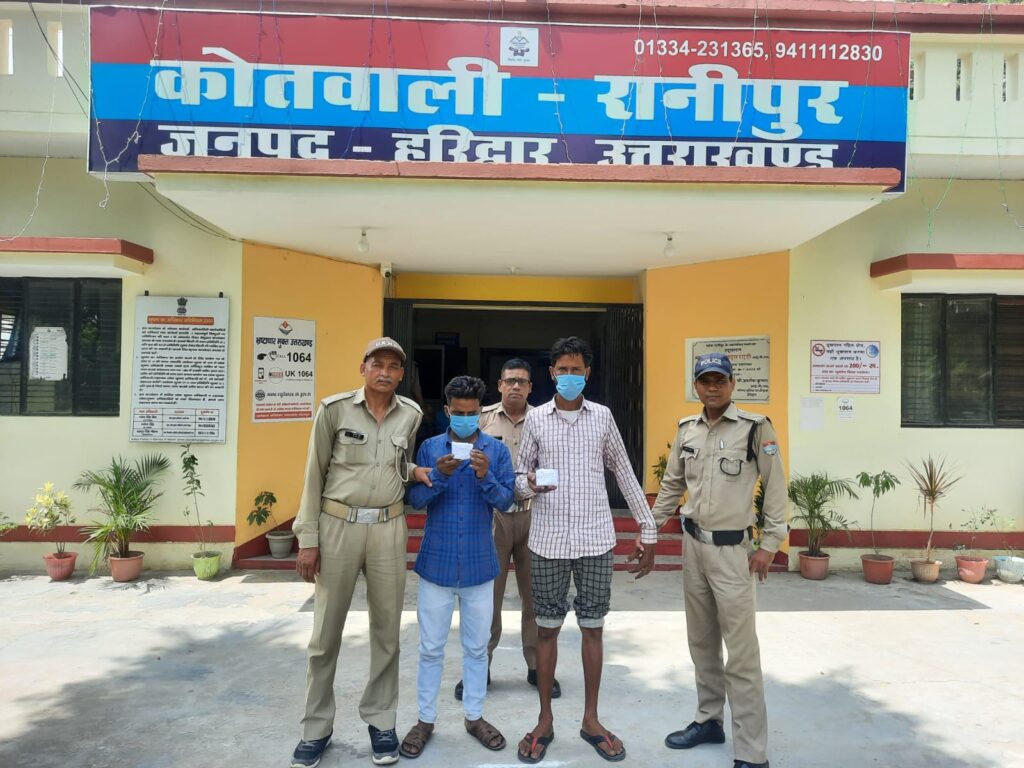 “अवैध मादक पदार्थ तस्करी में कोतवाली रानीपुर पुलिस द्वारा 02 अभियुक्तो को धर दबोचा”ड्रग्स फ्री देवभूमि अभियान के क्रम में श्रीमान वरिष्ठ पुलिस अधीक्षक महोदय के आदेश के अनुपालन में कोतवाली रानीपुर पुलिस टीम एव ए0डी0टी0एफ0 टीम द्वारा संयुक्त रूप से अभियान चलाते हुये,,दिनांक 18.08.2023 को मुखबिर खास द्वारा सूचना दी कि मो0सा0 नं0 यू0ए0 08 एएफ 4678 डिस्कवर से दो व्यक्ति बहादराबाद की तरफ से रेग्यूलेटर पुल की ओर आने वाले है, जिनके पास भारी मात्रा में स्मैक है, सूचना पर पुलिस टीम द्वारा दौराने चैकिंग रेग्यूलेटर पुल से उक्त मो0सा0 नं0 यू0ए0 08 एएफ 4678 सहित दो अभियुक्तगण 1- मुबारिक पुत्र शाहिद नि0 ग्राम गढ थाना रानीपुर हरिद्वार व 2- समीर पुत्र दिलशाद नि0 शक्तिनगर कोतवाली रानीपुर हरिद्वार को गिरफ्तार कर उनके कब्जे से 6.20 ग्राम व 6.80 ग्राम कुल 13 ग्राम अवैध स्मैक की बरामदगी की गयी, जिनके विरूद्ध थाने पर मु0अ0सं0 365/23 धारा 8/21 एनडीपीएस एक्ट का अभियोग पंजीकृत किया गया । गिरफ्तार अभियुक्तगण को आज मा0 न्यायालय में पेश किया जा रहा है।