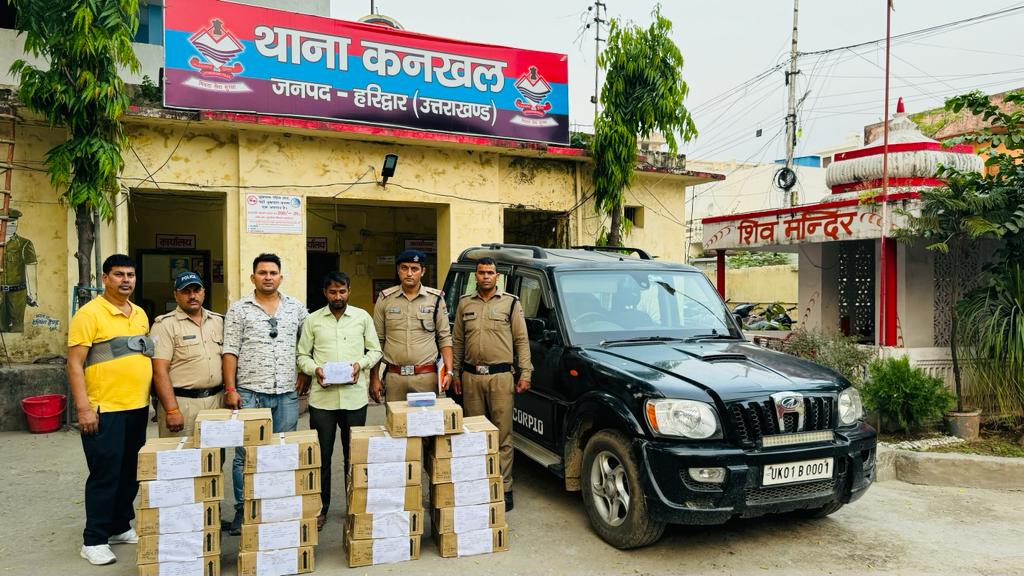 थाना कनखल,-माननीय मुख्यमंत्री उत्तराखंड द्वारा ड्रग्स फ्री देवभूमि मिशन 2025 के तहत जनपद को नशा मुक्त करने व नशा (अवैध शराब/स्मैक/ चरस/ गांजा आदि) तस्करों के विरुद्ध हरिद्वार पुलिस द्वारा चलाये जा रहे अभियान को सफल बनाने के क्रम में sho अमरचंद शर्मा द्वारा चार्ज संभालने के बाद ही क्षेत्र में लगातार चेकिंग अभियान चलाया एवं मुखबिर तंत्र को सक्रिय करते हुए आज दिनाक 07-10-2023 को द्वारा सूचना प्राप्त हुई कि एक स्कॉर्पियो कार संख्या UK01B-0001 जो सुल्तानपुर की तरफ से आ रही हैं जिसमें भारी मात्रा में शराब ले जायी जा रही है इस सूचना पर चौकी बैरियर पर सघन चेकिंग अभियान चलाकर अभियुक्त शकील पुत्र नसीर निवासी हाजी वाली मस्जिद नैनपुर सुल्तानपुर कोतवाली लक्सर जनपद हरिद्वार को घेराबंदी कर निकट चौकी बैरियर पर वाहन स्कॉर्पियो संख्या UK01B-0001 से 22 पेटी देशी शराब पिकनिक मार्का का परिवहन करते पकड़ा जिसके संबंध में थाना कनखल पर अभियोग पंचकृत करते हुए आवश्यक विधि कार्रवाई की जा रही है l