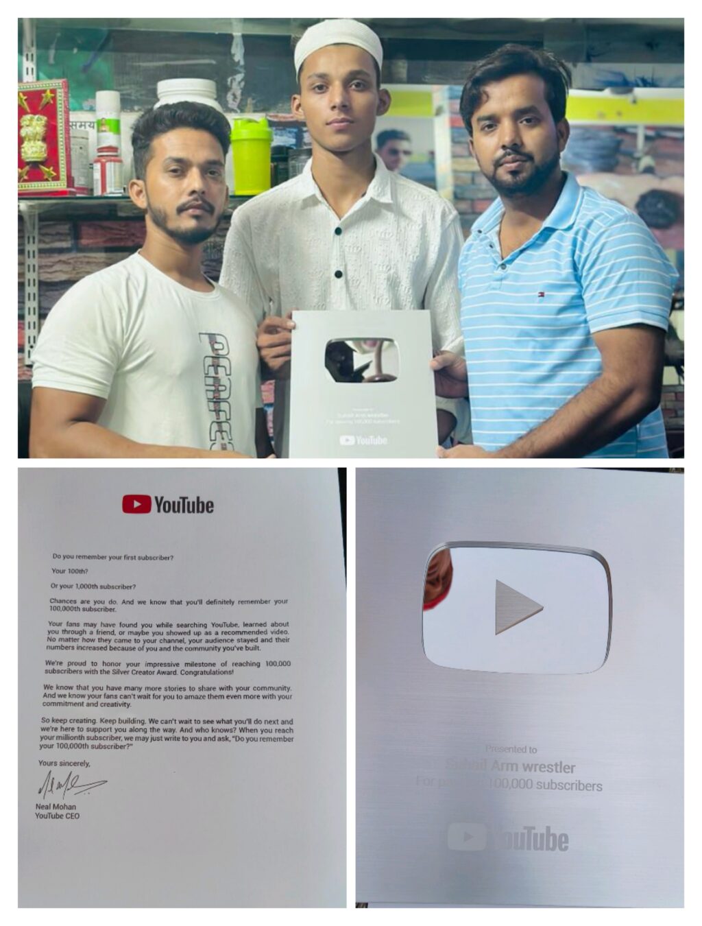 गांव सलेमपुर निवासी राव सुहैल आर्म रेसलर पंजा किंग को यूट्यूब द्वारा दिया गया सिल्वर बटन जिसकर पाकर राव सुहैल और उनके फैंस मैं खुशी की लहर है आपको बता दें सिल्वर बटन पाने वाले राव सुहैल एक मात्र ऐसे रेसलर है जिन्होंने पूरे भारत मैं अपना परचम लहरा रखा है साथ ही इस वक्त राव सुहैल के you tube पर 1.5 लाख और इंस्टाग्राम 3.75 लाख और फेसबुक पर 1.4 लाख सुहैल