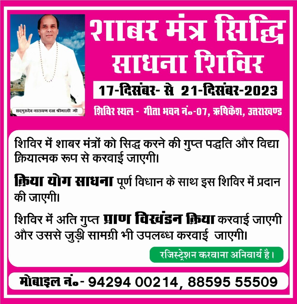 17 से 21 दिसम्बर को ऋषिकेश में पांच दिवसीय शाबर मंत्र सिद्धि साधना शिविर का आयोजन होगा।